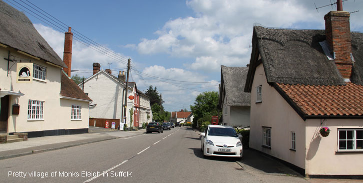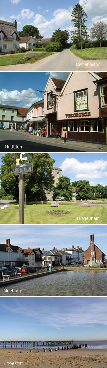 Dotted with the most attractive cottages and farmhouses, Suffolk is a peaceful, rural county, with gentle rolling farmland that appears to stretch for miles. It has some of England's best examples of small medieval towns, country churches, moated farmhouses, mills and castles. Lavenham is probably the best example of a medieval town which originally built its wealth on the cloth trade. Today, you will find pretty colour-washed and half-timbered buildings in charming villages and market towns, pubs with good traditional English food. Other medieval towns worth visiting are those of: Long Melford, Hadleigh, Boxford, Bildeston, Clare, Cavendish, Groton, Kersey, and Monks Eleigh.