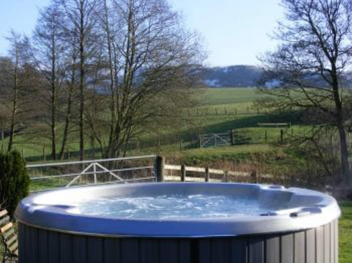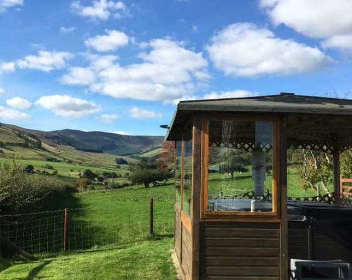 The setting of the hot tub at Caban y Berwyn is absolutely stunning with views out over the surrounding valley. This hot tub, although outdoors is covered in an outbuilding with glass windows so you can look out, lie back in your bubbly spa bath and enjoy soaking up those views come rain or shine!