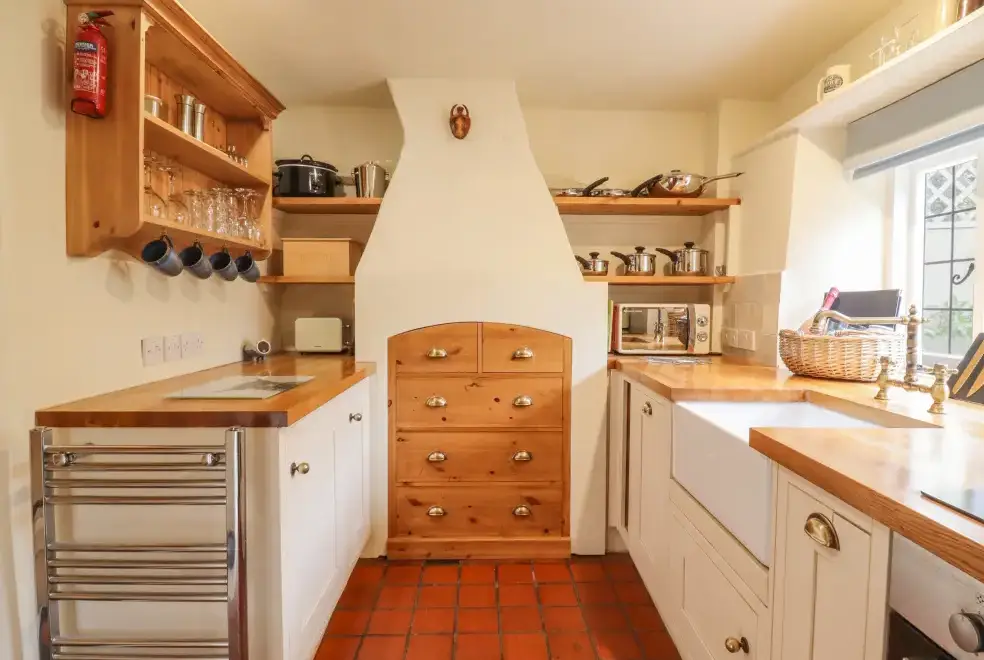 Step through the door of Wayside Cottage and be greeted by the enchanting hallway with its lovely oak floors and inviting lighting. The lounge just adds to the beauty of the cottage, with gorgeous, beamed ceilings and the warm comfort of a wood burner to curl up in front of. Relax on the lavish chairs and watch your favourite Netflix shows on the TV, or just catch up with family and friends during a slow morning.