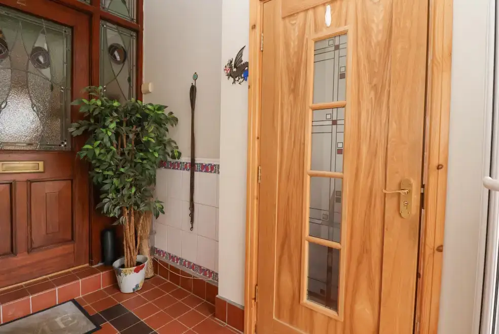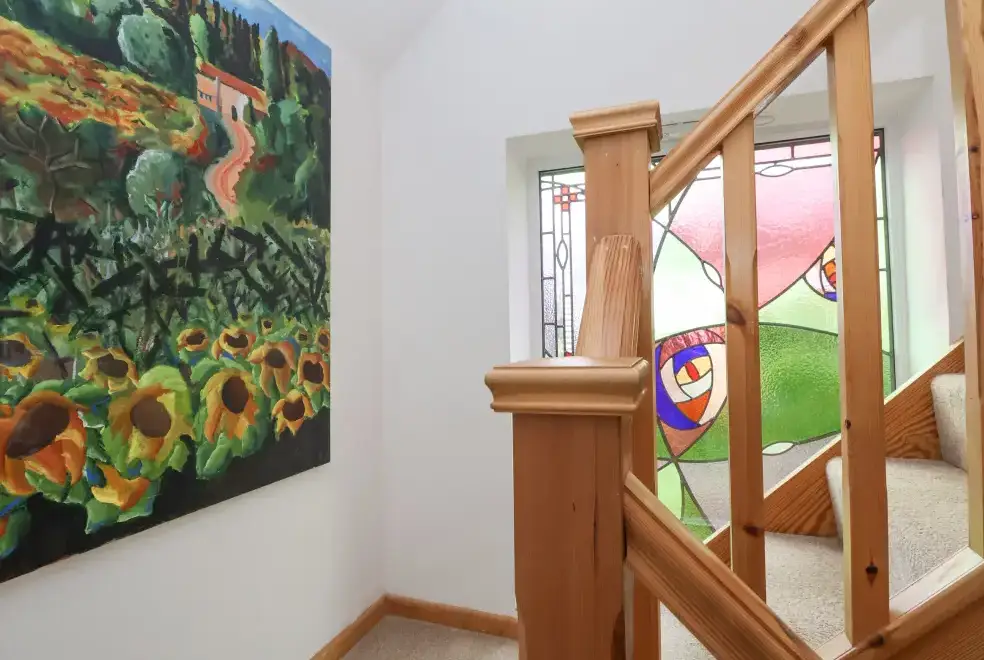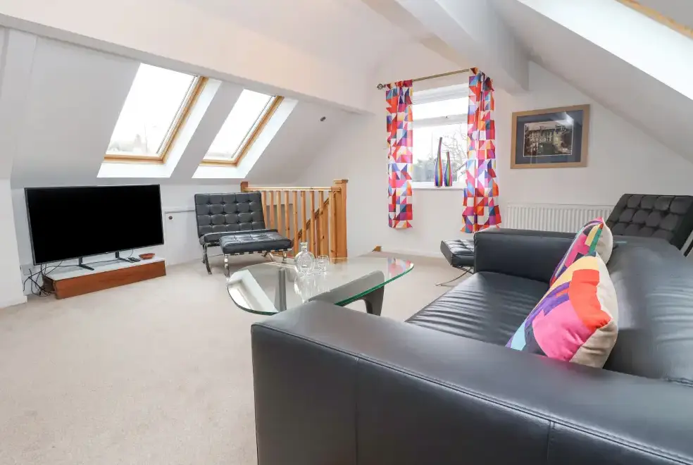 Located just a mile from Chester city centre, Dragon's Den serves as a perfect touring base for exploring the wider region, including Liverpool, Manchester, North Wales, and Shropshire. This high-quality first-floor apartment is positioned in a desirable area close to the racecourse and River Dee. With its Bauhaus-inspired furniture and Art Nouveau stained glass windows, this Chester apartment provides a unique blend of style and comfort. Guests can access the apartment via a private internal staircase from a shared and secure porch. Inside, the apartment features a spacious lounge with luxurious Mies Van Der Rohe chairs and a Noguchi-style coffee table, ensuring a comfortable stay.