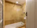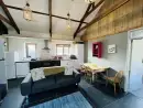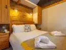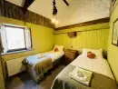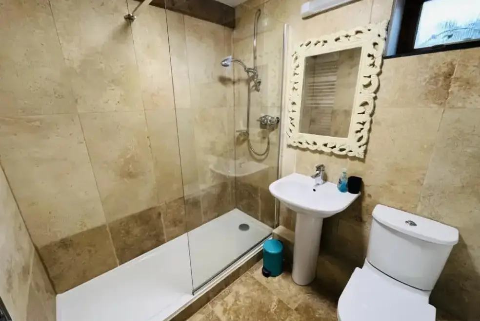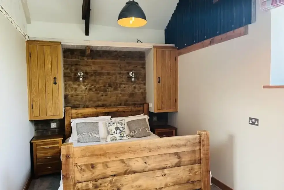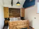 In the evening, there are two bedrooms to choose from; the master bedroom is a lavish space with a wooden king-sized bed to match the wooden walls behind. It’s a cosy, charming space that Is sure to provide a lovely night’s sleep so you’ll wake up rested and ready for a new day. Or, choose the twin room, another wonderfully designed room with high beamed ceilings and bright walls with wooden accents, completing the rooms rustic and natural vibe. And if you’re a light sleeper then you’ll be grateful for the blackout blinds! The stylish bathroom has a convenient walk-in shower, a sink and a toilet.