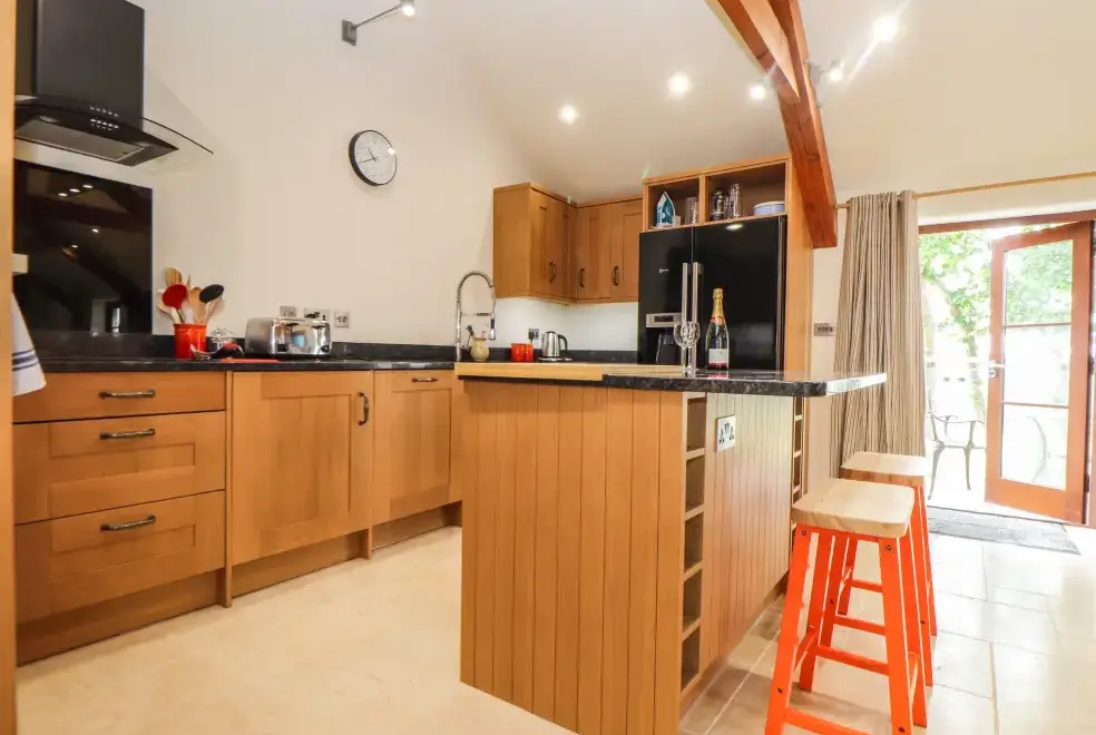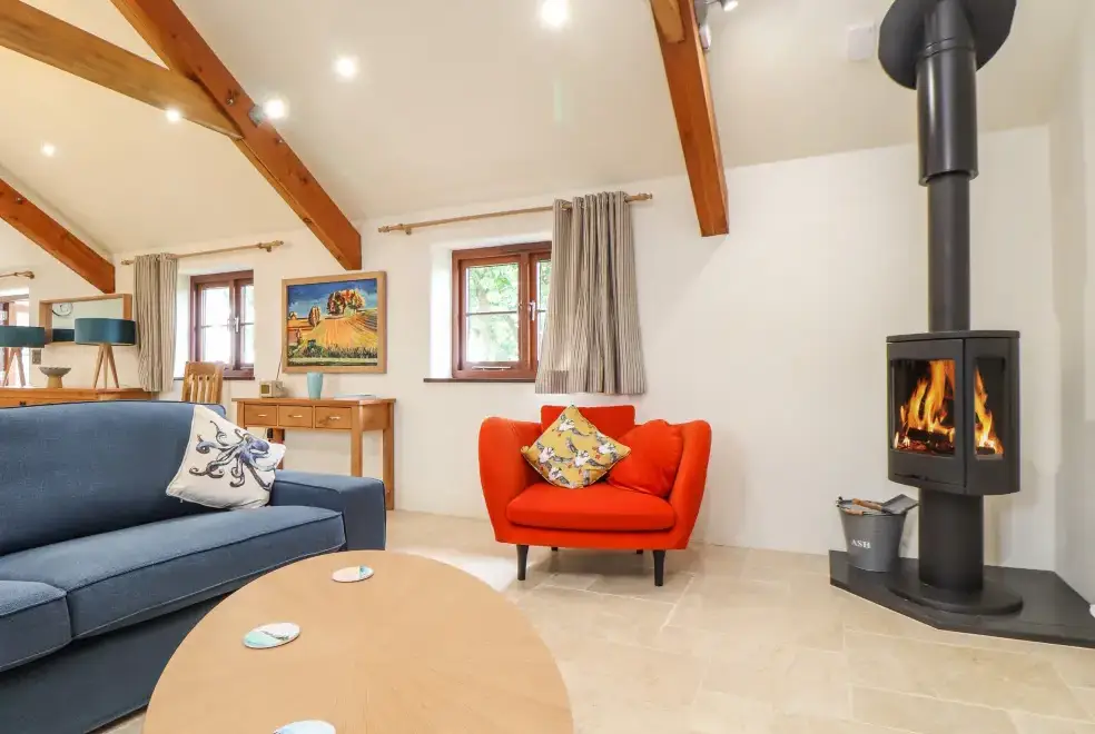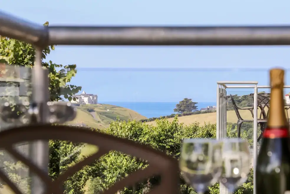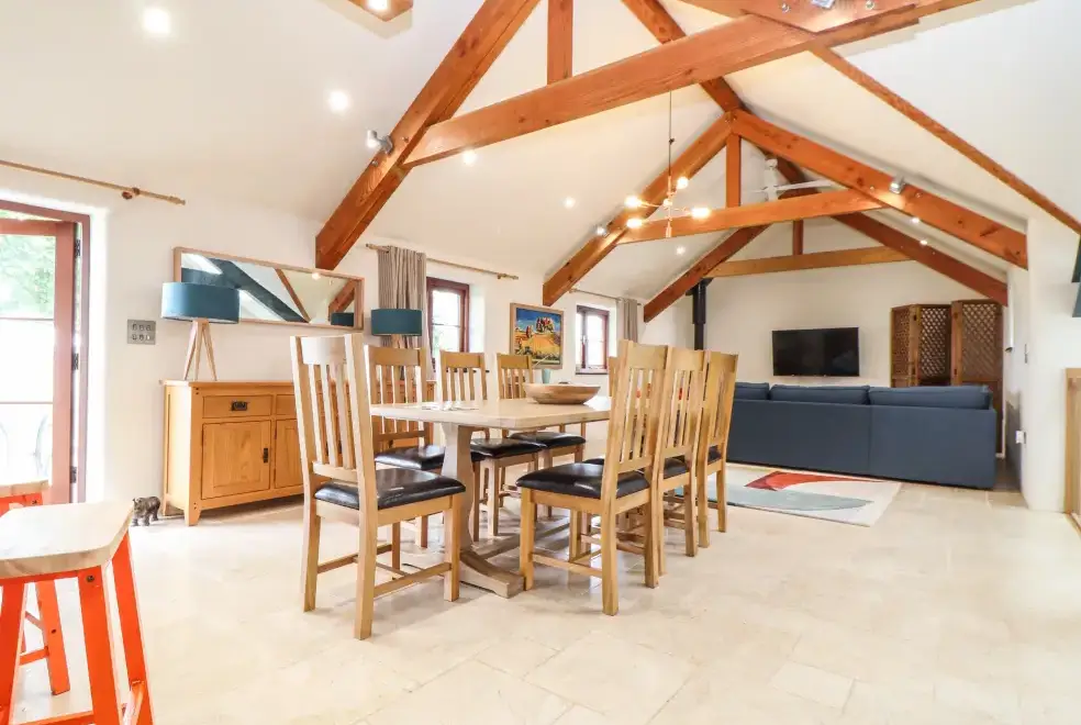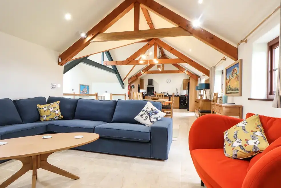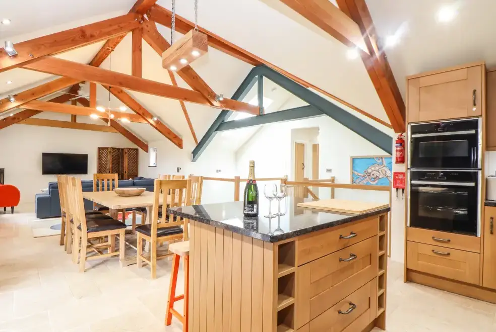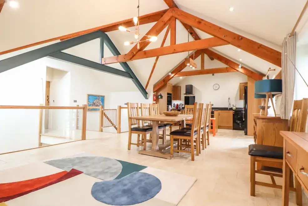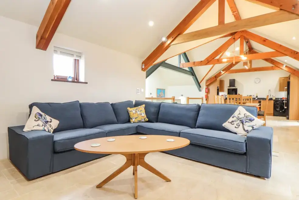 The first-floor open-plan living area at Polurrian House is perfect for a family-friendly holiday in Cornwall. It features a fully equipped kitchen, dining area for eight guests, and a sitting area with a Smart TV, woodburning stove, and balcony. Enjoy modern amenities like an electric oven, induction hob, combi microwave/oven, fridge/freezer, washing machine, tumble dryer, dishwasher, coffee machine, and blender. The corner sofa in the sitting area comfortably seats six guests, making it ideal for family gatherings.