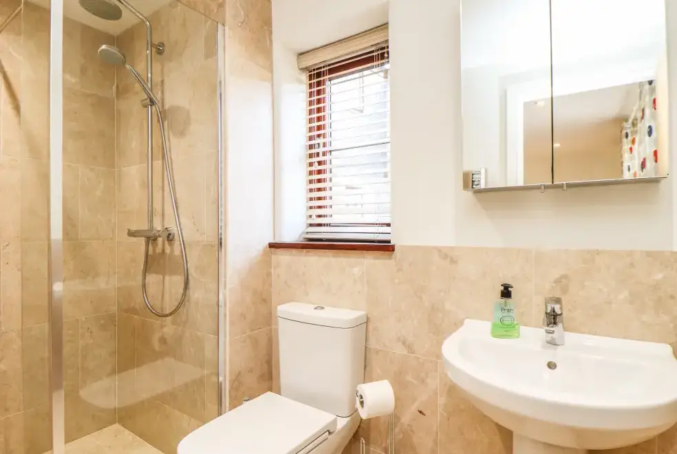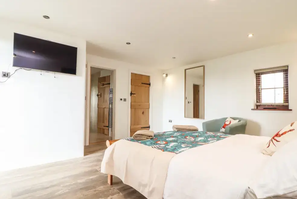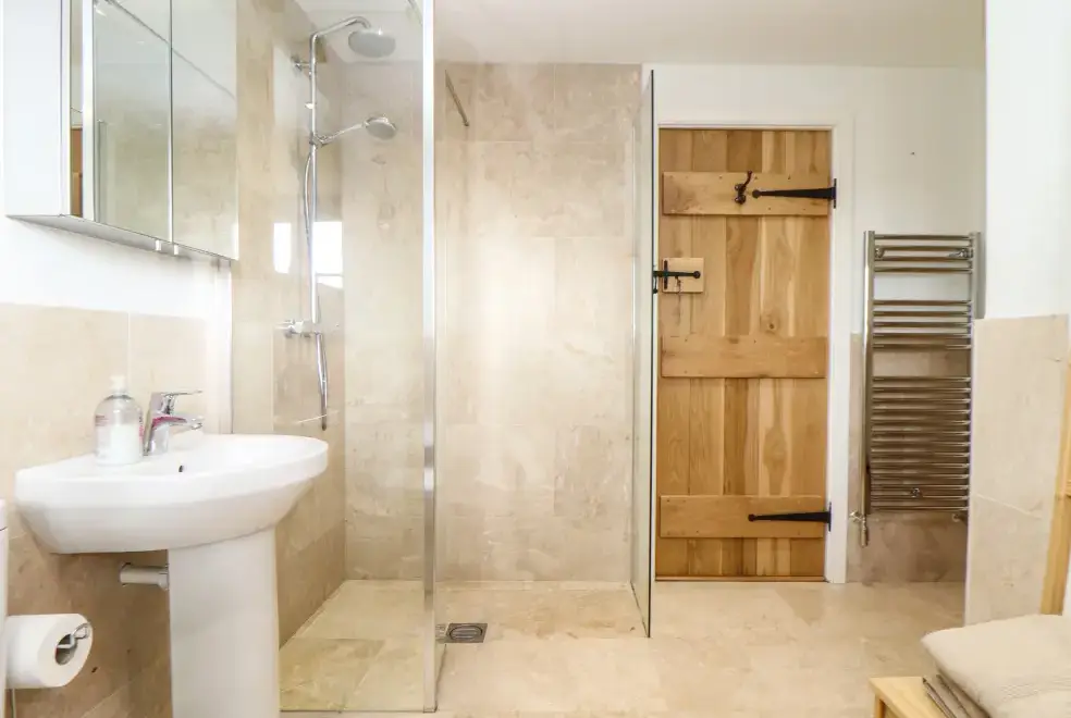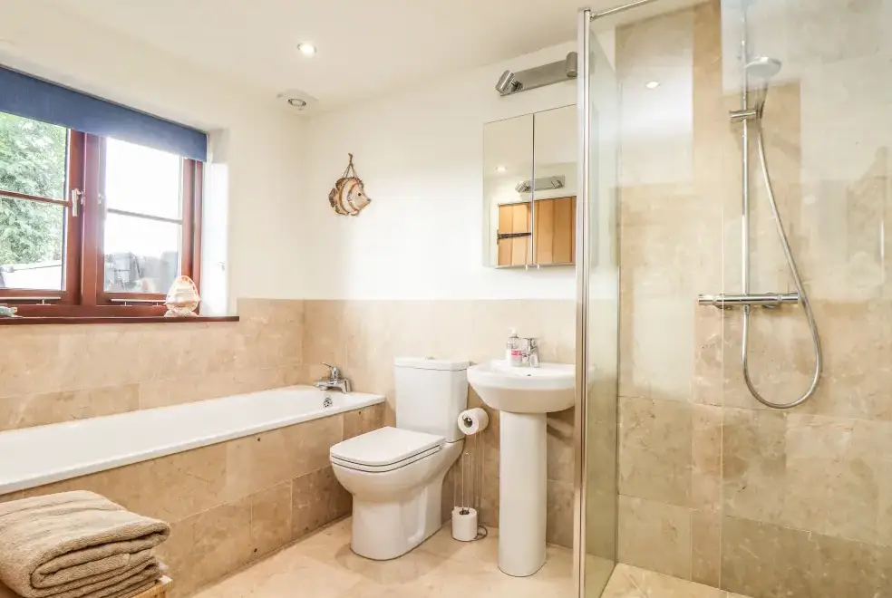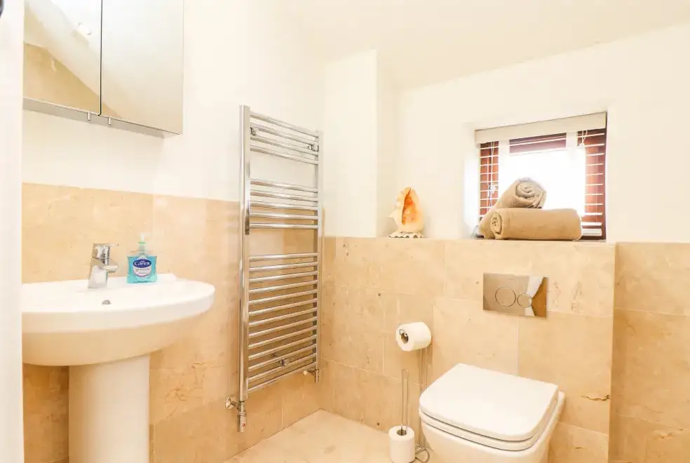 Polurrian House offers four luxurious bedrooms: a king with TV and en-suite bathroom, two ground-floor kings, one with TV and Jack-and-Jill family bathroom access, and a ground-floor twin with en-suite shower room. The reverse-level design ensures privacy and comfort, perfect for a family-friendly holiday in Cornwall. The ground-floor Jack-and-Jill bathroom includes a bath, walk-in shower, basin, heated towel rail, and WC.