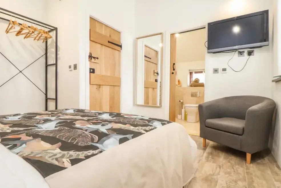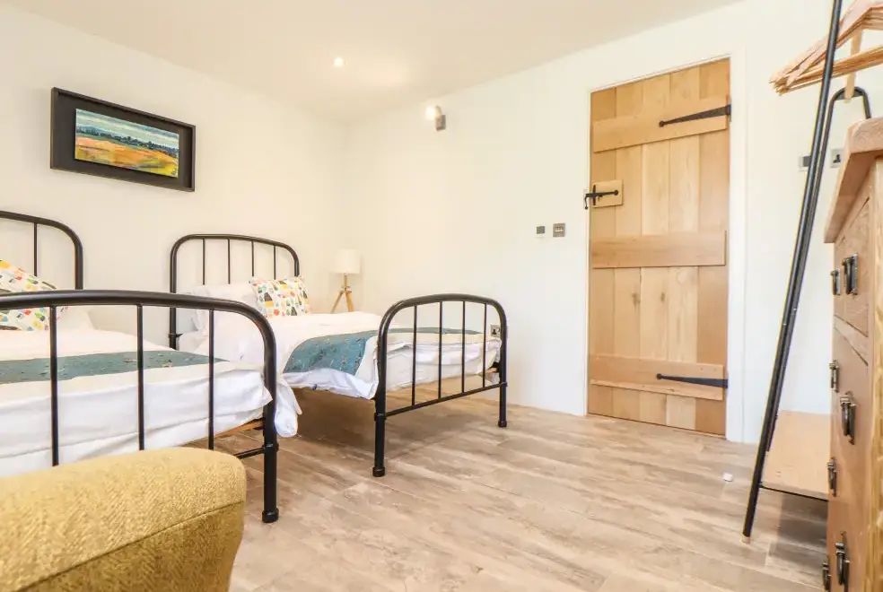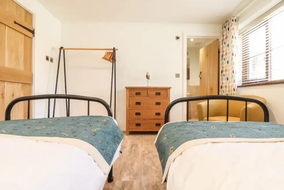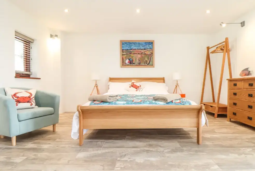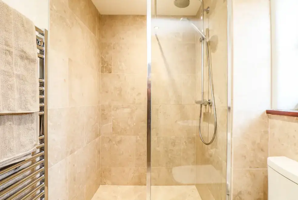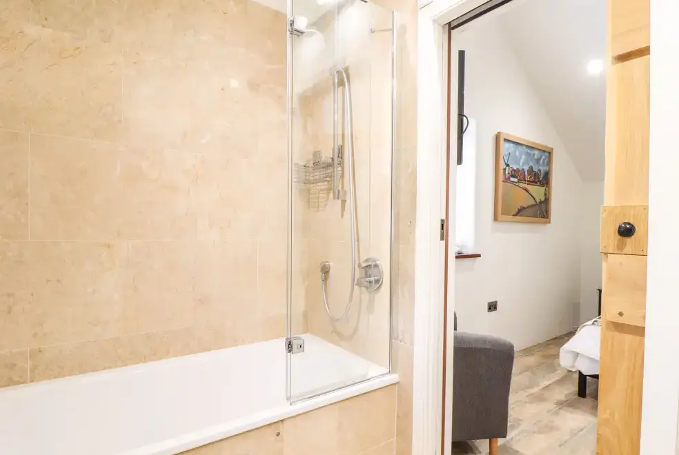 Polurrian House offers four luxurious bedrooms: a king with TV and en-suite bathroom, two ground-floor kings, one with TV and Jack-and-Jill family bathroom access, and a ground-floor twin with en-suite shower room. The reverse-level design ensures privacy and comfort, perfect for a family-friendly holiday in Cornwall. The ground-floor Jack-and-Jill bathroom includes a bath, walk-in shower, basin, heated towel rail, and WC.