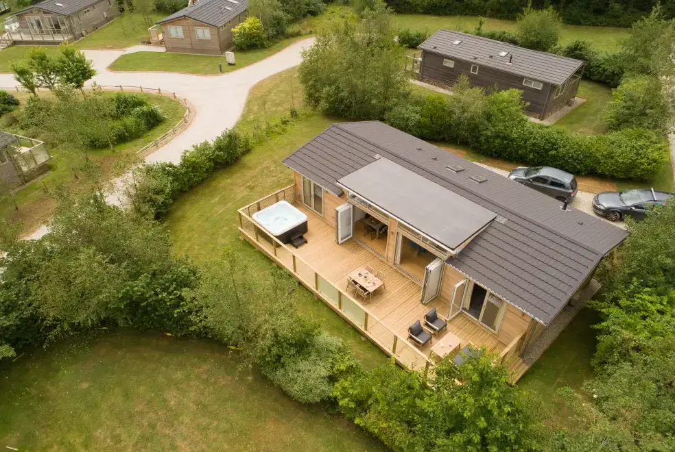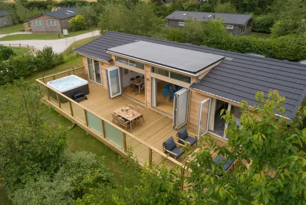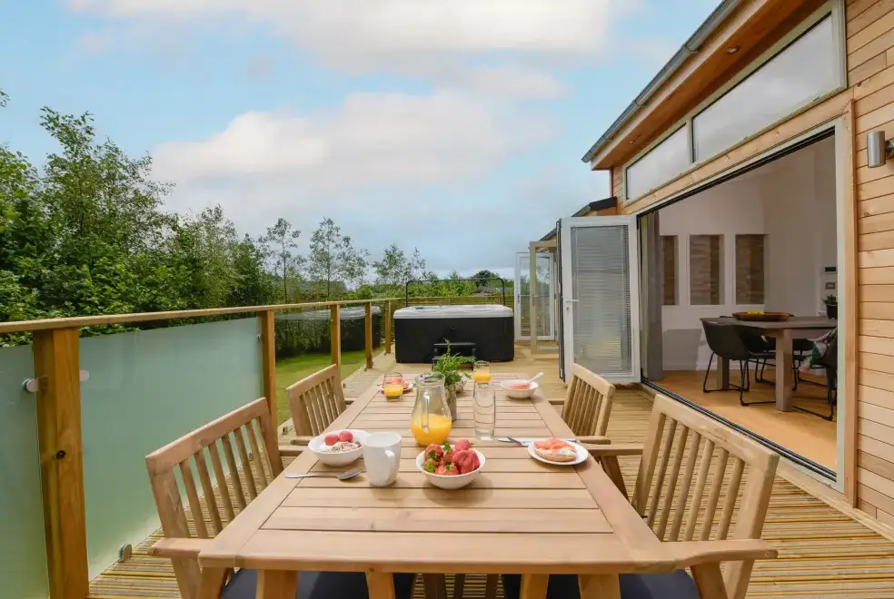 Outside the lodge, guests can enjoy a private decking area furnished with comfortable seating and an indulgent hot tub, perfect for unwinding. There's also off-road parking for one car and an EV charging point. The rental includes WiFi, fuel, power, bed linen, and towels. Please note that pets are not allowed, and the property maintains a no-smoking policy. For families with young children, a travel cot (no mattress) and highchair are available. Guests should be aware that there is a lake on-site, and children need supervision at all times. Barbecues are not permitted on-site, and Sunday arrivals are not allowed.