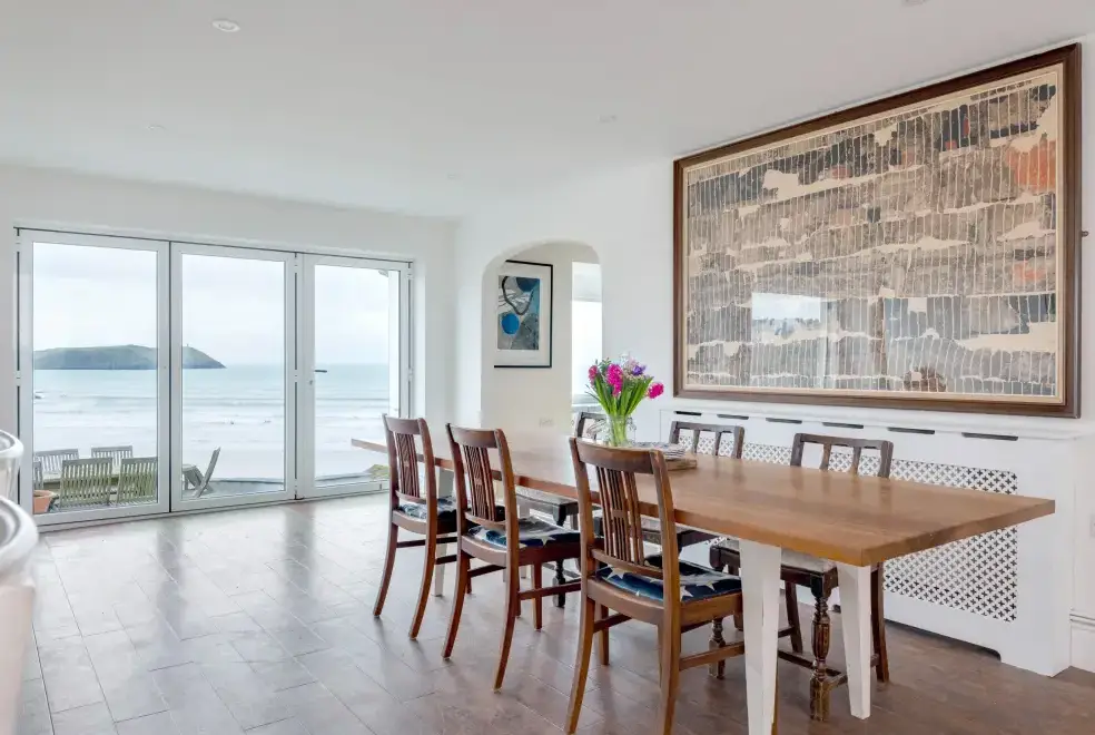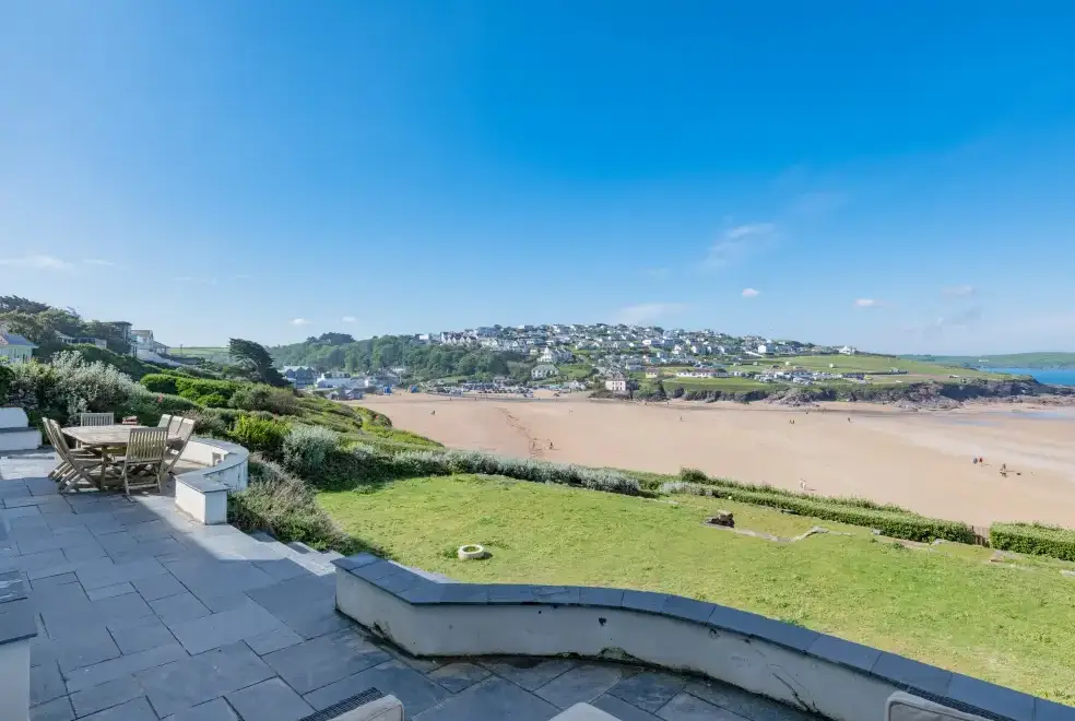 The interior of Treverden is spread over three floors, featuring a variety of bedroom configurations to suit all needs. The first floor boasts three stylish bedrooms with super king-size beds and en-suite bathrooms, alongside a cosy bunk bedroom. The second floor offers a bedroom with four single beds and another with a super king-size double that can be set up as two singles. The ground floor includes a new dining room with a 16-foot table, perfect for family meals, while the open-plan kitchen and living area flow seamlessly to the stunning stone terrace, ideal for social gatherings.