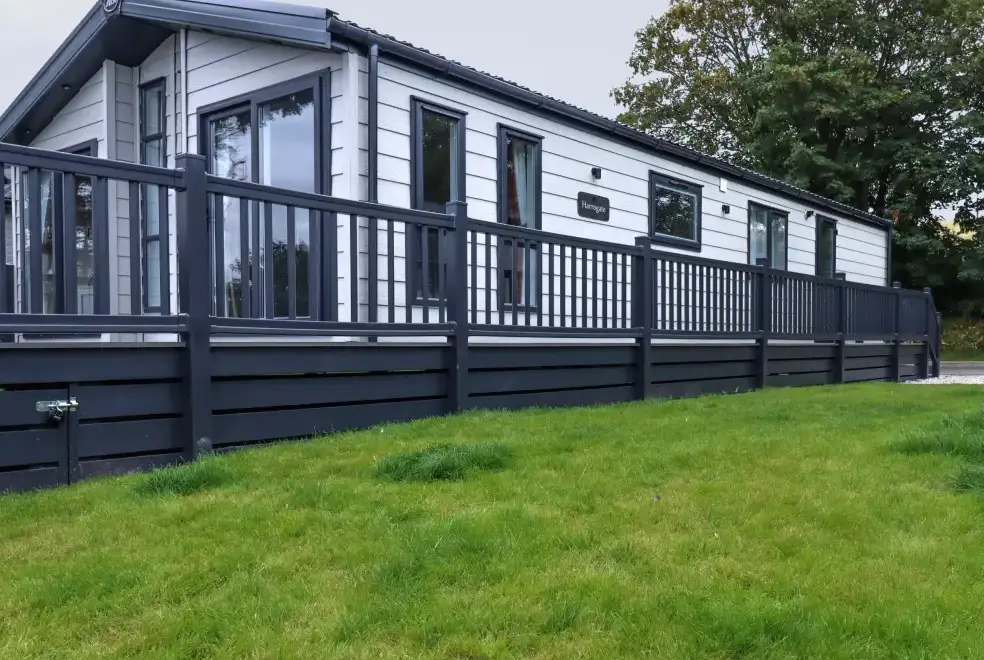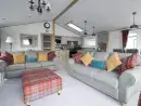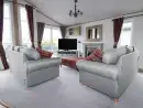 Discover a good quality lodge holiday in Porth, just north of Newquay in Cornwall. Porth is home to a deep sandy beach that would delight young and old. This lodge holiday home is very attractive inside, like most lodge holidays it has an open plan living, kitchen and dining area. Furnished in a stylish contemporary manner, grey sofas stand around the television, red and grey plaid cushions and a foot stool add accents of colour which match the curtains.The kitchen has a breakfast bar with three stools, a range cooker and utensils and crockery for your self-catered holiday. It is fitted with an electric oven, a gas hob, a microwave, dishwasher and a fridge freezer for your food. A dining table with six chairs stands in front of the window. The main bedroom is a double, it has a television for lazy viewing in bed, and its own shower room. There are two more twin bedrooms.