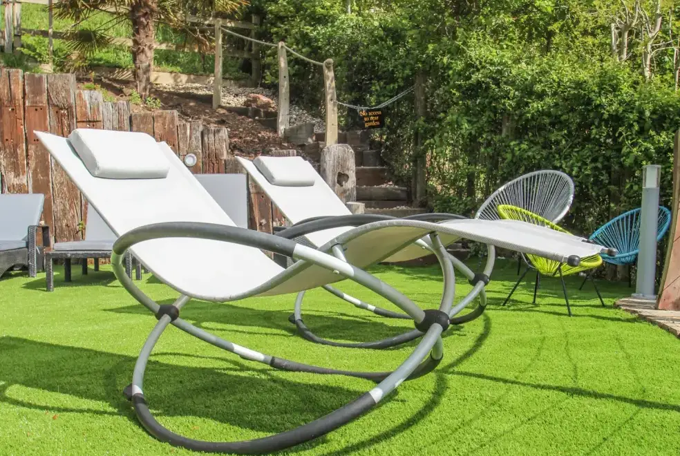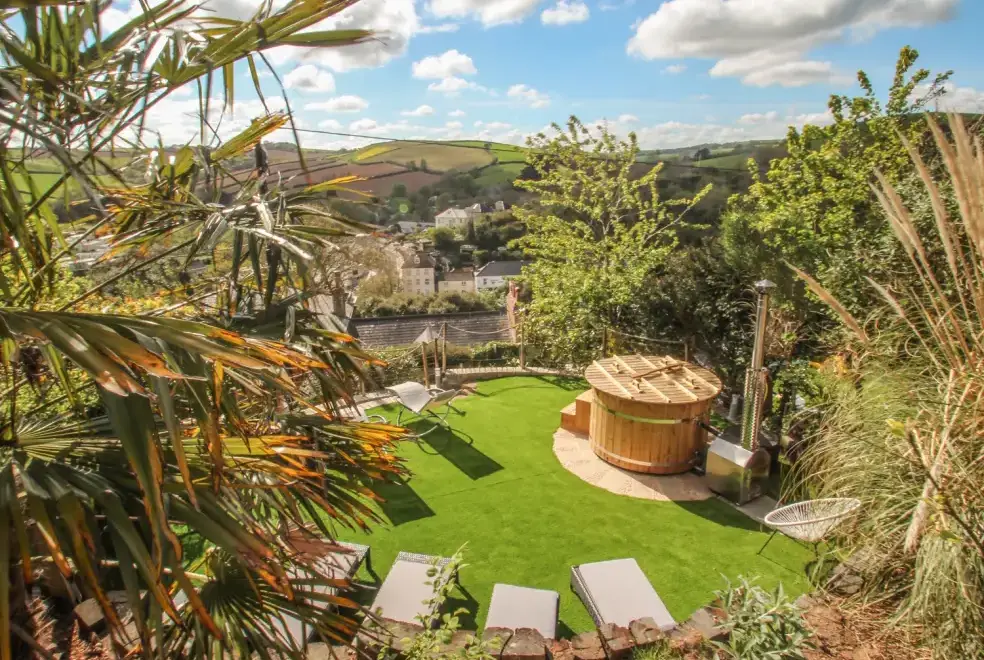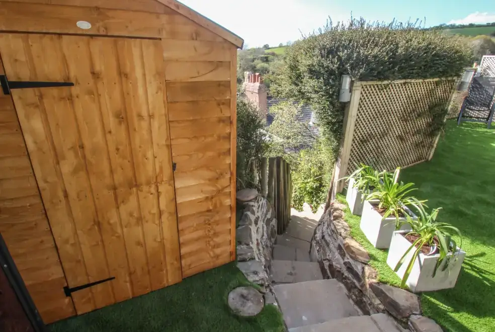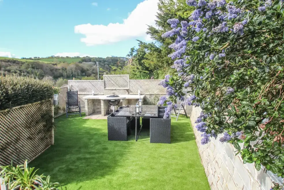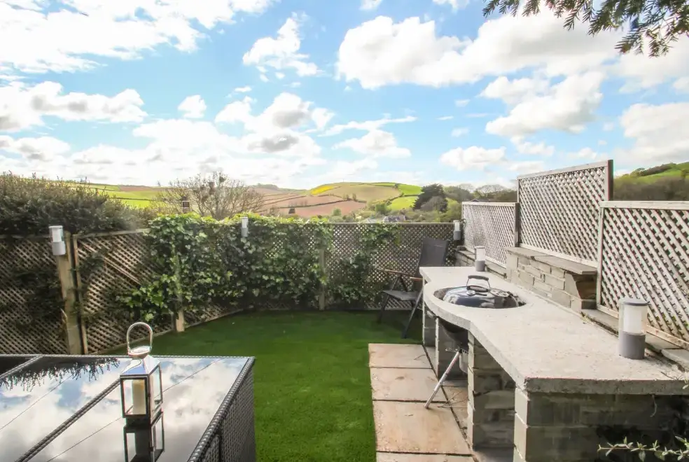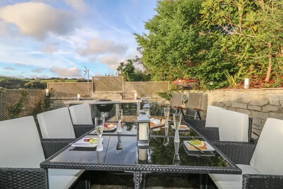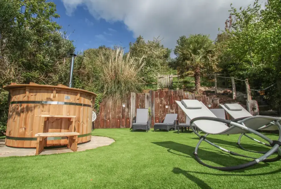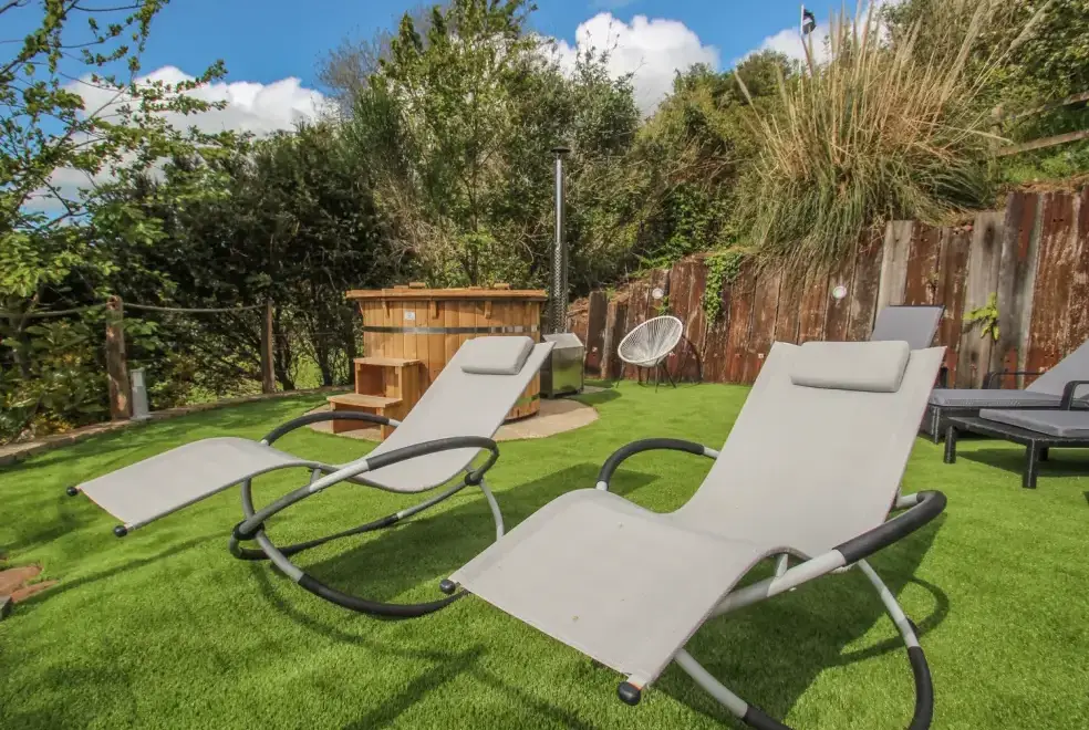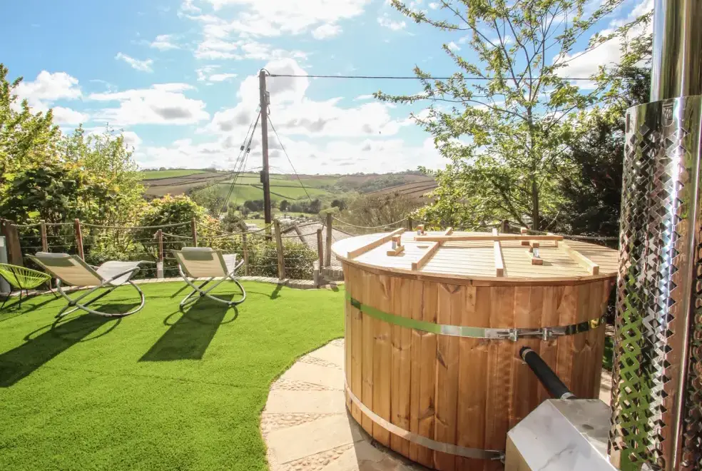 Sea Cliff Cottage offers ample outdoor living space with a front terrace perfect for dining, featuring a large gas BBQ and a scenic rural outlook. The rear garden is tiered over three levels, accessible from the first floor. The first tier hosts an outdoor kitchen with a coal barbecue and dining area. A small flight of steps leads to the sunbathing tier, where guests can enjoy the Eco wood-fired hot tub and rocking sun loungers, complete with complimentary spa robes. Pentewan Beach, known for its golden sands, offers excellent conditions for kayaking, water skiing, or a leisurely dip. Access to the beach is easy by following the path just outside the cottage.