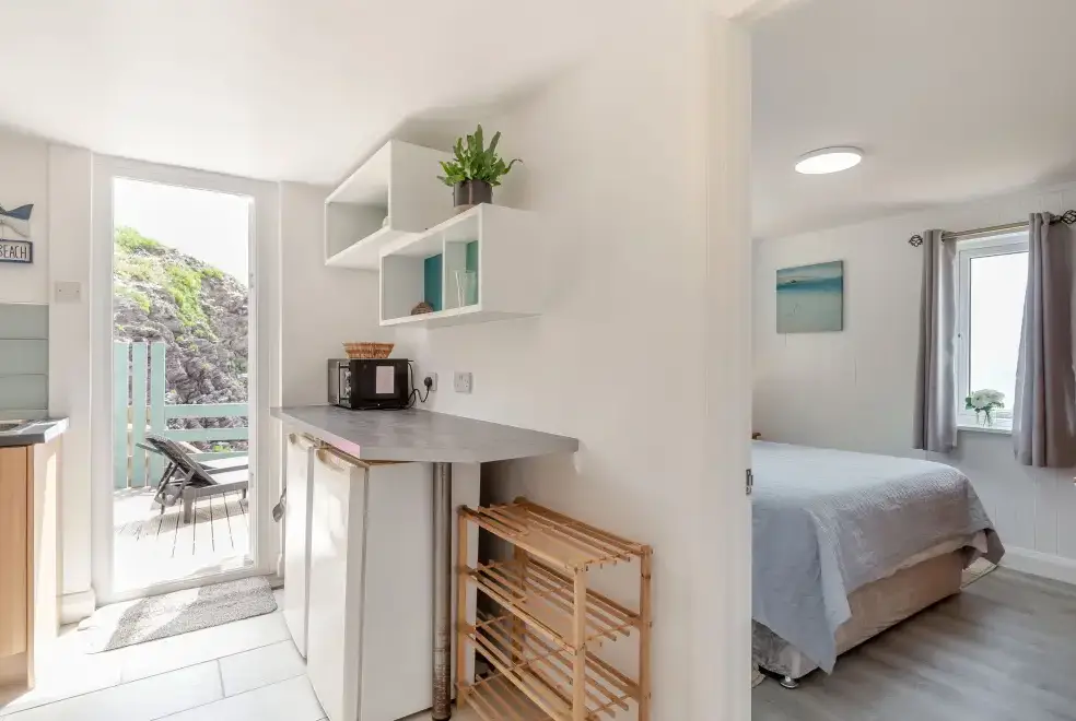 Beachcomber's Cottage, a beautifully renovated former fisherman's residence, nestles at the base of Tregonhawke Cliffs, just a mile from Whitsand Bay in Cornwall. This ground floor apartment caters to couples, featuring a cosy double bedroom and a well-appointed family shower room. The interior includes a modern kitchen and a comfortable sitting room with a dining area, perfect for a romantic retreat. Roadside parking is conveniently located on the clifftop with a decking area offering scenic sea views and benches for relaxation.
