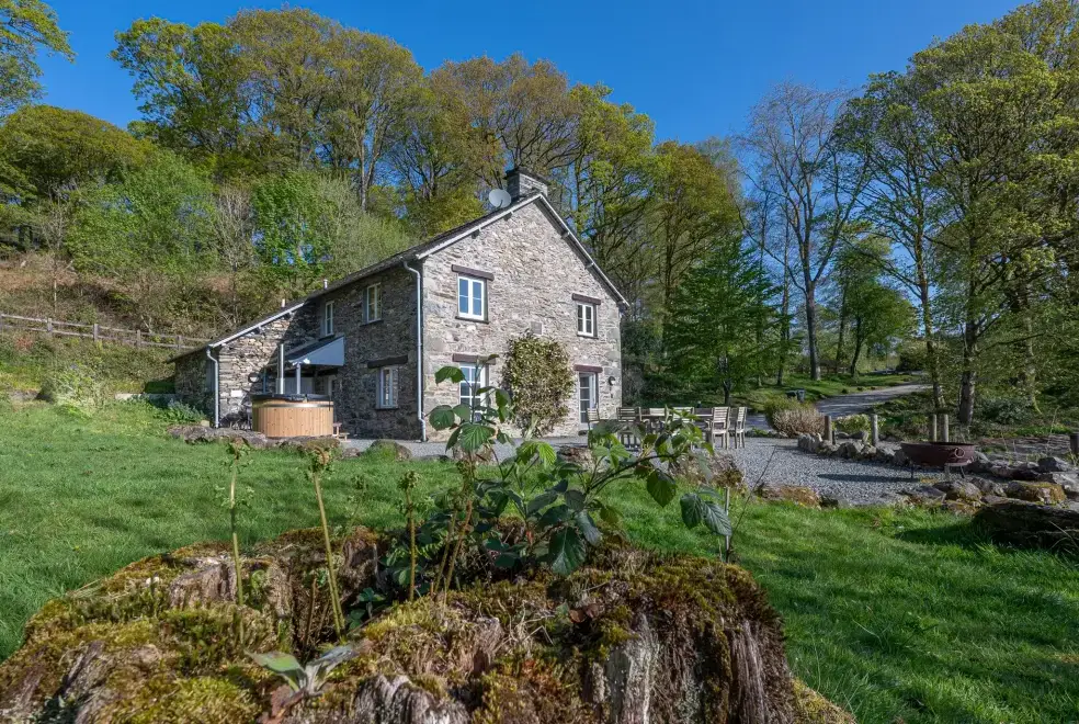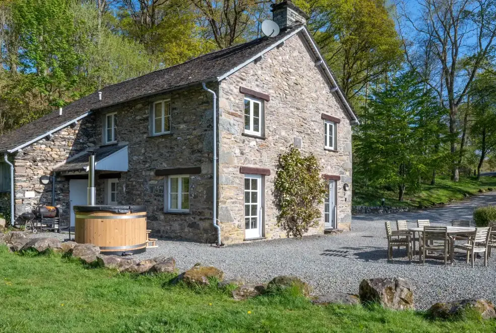Hammerhole is a charming detached cottage situated beside Lake Windermere on the Graythwaite Estate near Hawkshead in the Lake District. This delightful Lake Windermere cottage offers five bedrooms, including two king-size doubles and three twins, comfortably accommodating up to ten guests. The cottage boasts two family bathrooms, a ground floor shower room, a kitchen with a dining area, and a sitting room with a gas fire and patio doors opening directly to Lake Windermere. Outside, enjoy a utility room, ample off-road parking, a wood-fired hot tub, and a patio garden with furniture.