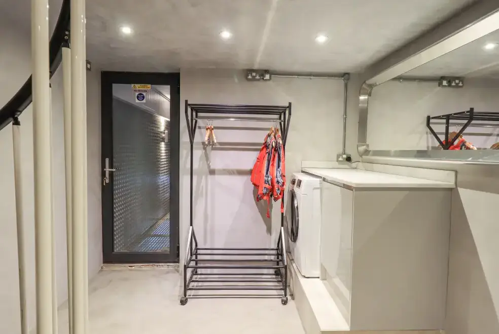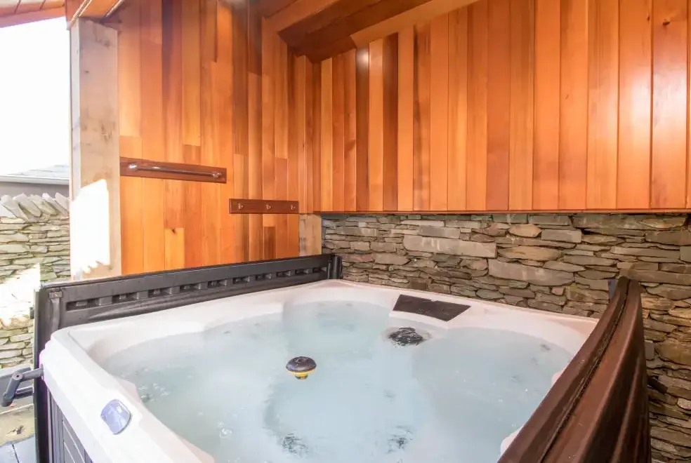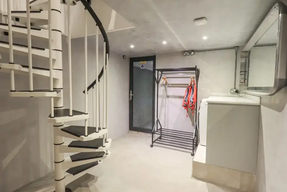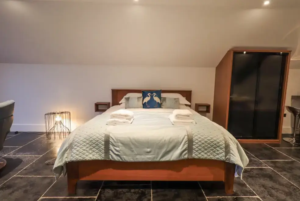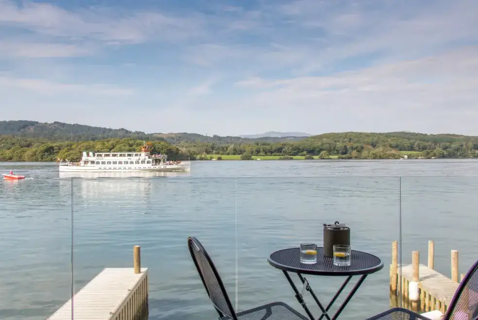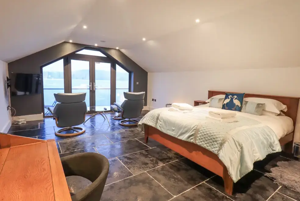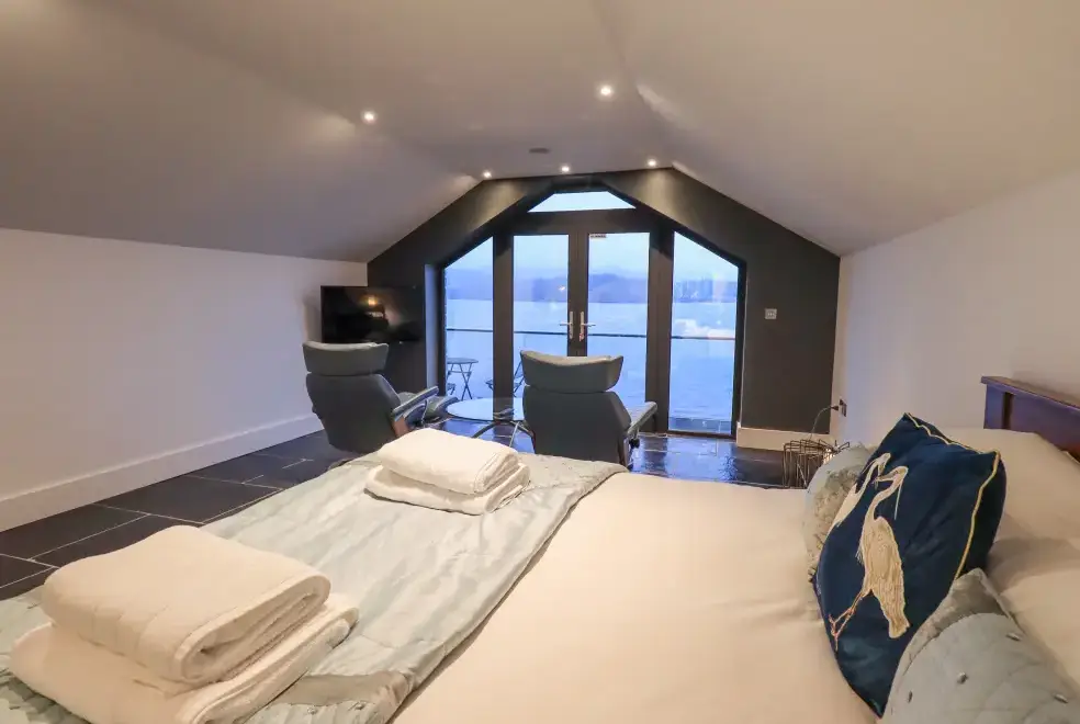 Ascend a narrow spiral staircase to the bright and airy first-floor open-plan living space. Here, you can relax on Norwegian stress-less chairs in the sitting area or enjoy romantic meals in the dining space. The bedroom area with a super king-size bed opens onto a balcony with breathtaking views of Lake Windermere, making it the perfect spot for a morning tea or evening drink. For ultimate relaxation, head outside to the private hot tub for two, conveniently undercover for year-round use. The property also offers access to a wet dock and a two-man kayak for adventurous guests.