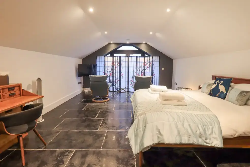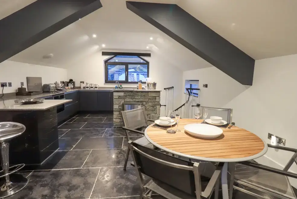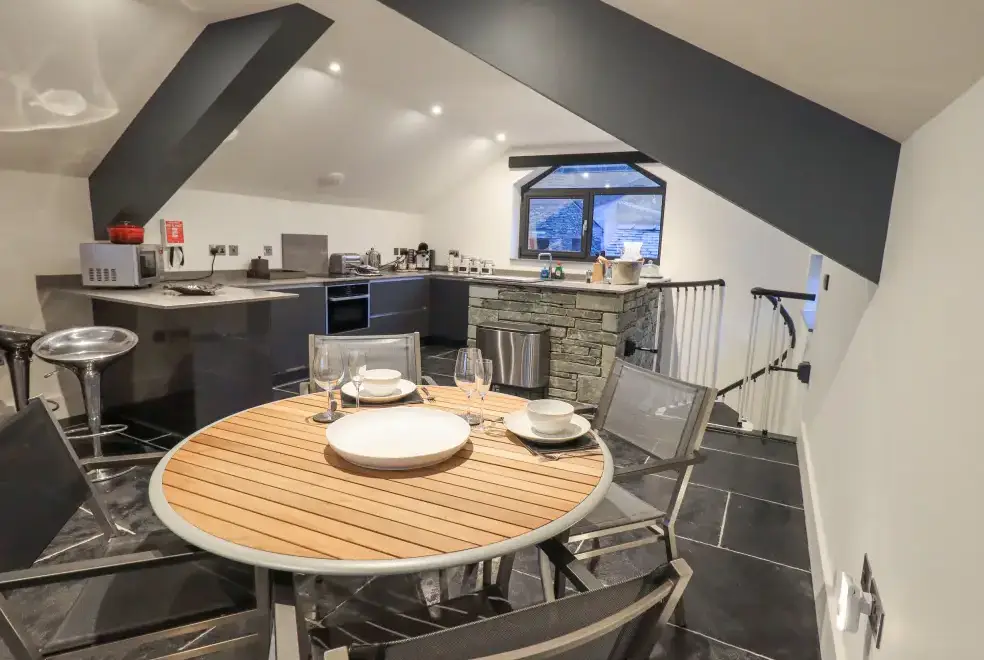 The Boat House at Louper Weir is a charming boathouse conversion located on the outskirts of Bowness-on-Windermere in the stunning Lake District. This enchanting property features a king-size bedroom within a first-floor studio layout, offering a cosy space for up to two guests. The open-plan design includes a bedroom area, a well-equipped kitchen, a dining space, and a sitting area that opens onto a balcony. Guests can enjoy a private hot tub and a designated parking space, making The Boat House at Louper Weir the perfect choice for a romantic retreat in the Lake District.