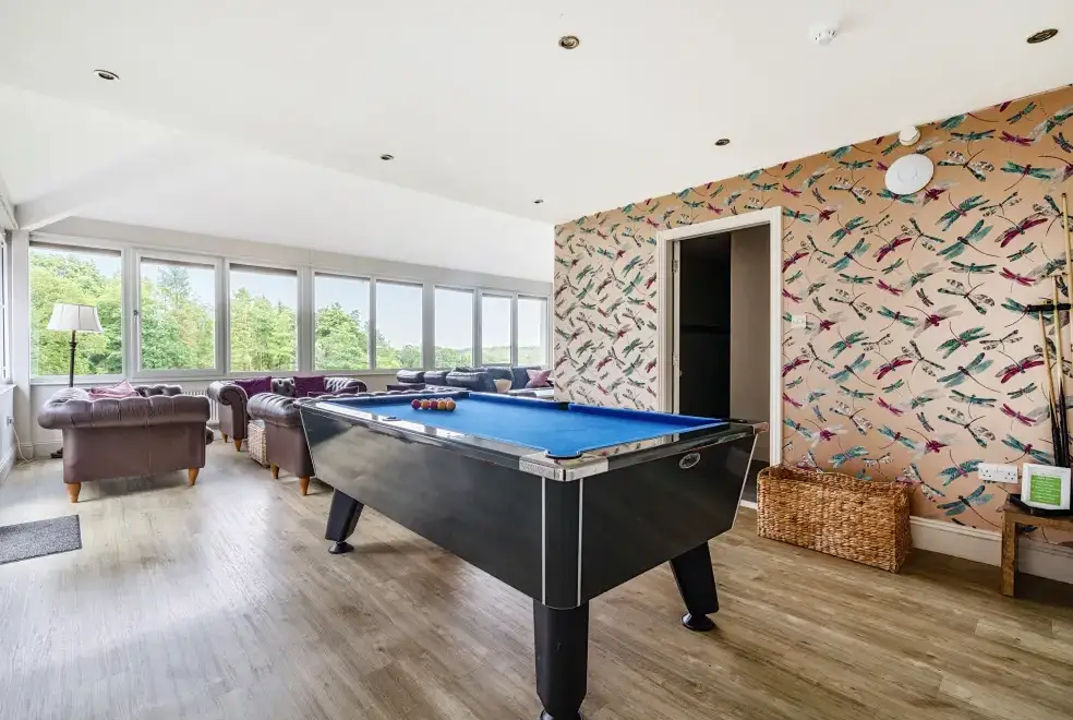 The Oaks offers two ground floor bedrooms with ensuite facilities, including one designed for wheelchair access, making it perfect for those with limited mobility. The first floor hosts ten impeccably designed bedrooms, eight with ensuite facilities, and most with views of the garden and woodlands. A master bedroom, modern house bathroom, and a well-laid-out family room with a sofa bed complete the accommodation. The property includes a pantry, washing and drying room, and two separate staircases leading to the first floor, ensuring convenience for large groups.