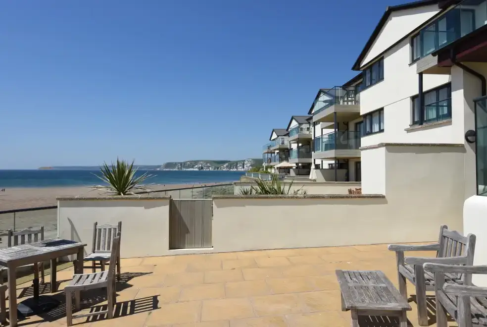 Apartment 5 is a stunning ground floor beachside apartment located just 20 yards from the beautiful sandy beach in the charming Devon coastal village of Bigbury-on-Sea. This seaside retreat comfortably accommodates six guests across two en-suite bedrooms, including a double and a twin, with additional sleeping space on a new king-size sofa bed in the living area. The apartment's open-plan living space offers fantastic sea views and includes a seating area, dining space, and a well-equipped kitchen. Glazed doors lead out to a terrace furnished for relaxation, featuring an electric barbecue for outdoor dining.