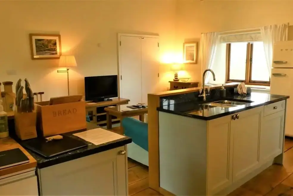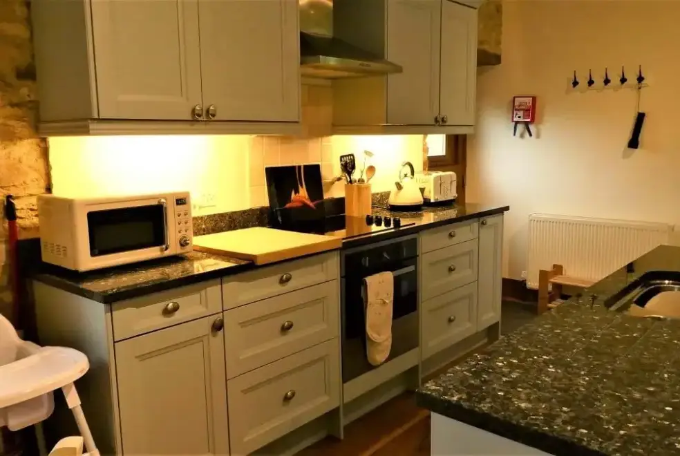 • The heart of this holiday home is the open plan living area with warm lighting. This area features a comfy lounge area with comfortable sofa and armchairs, TV, and a well-equipped high quality kitchen with granite worktops and dining area. The kitchen area features a Smeg fridge/freezer, ceramic hob and electric oven, dishwasher, microwave, toaster and kettle for easy self-catering. This area is on the first floor to maximise on the stunning views.
