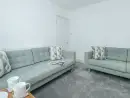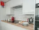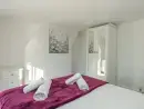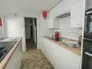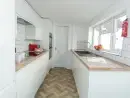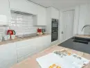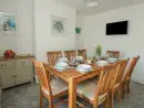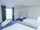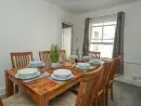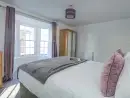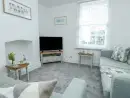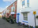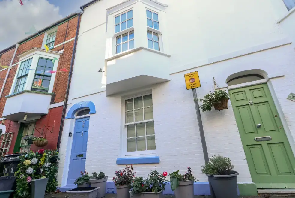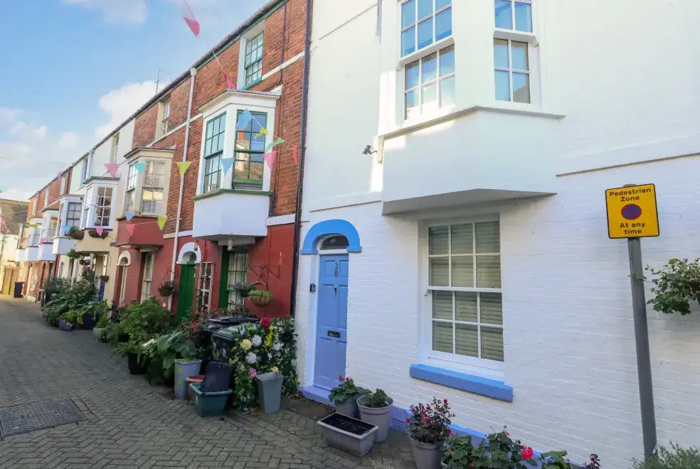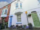 An attractive white washed cottage with a sky blue front door stands in a row of terraced cottages in the heart of Weymouth in Dorset. The accommodation is spread across three floors and includes 4 bedrooms and two bathrooms. This property is just a couple of streets away from the sea front and near several eateries and shops. As a town house it does not have a front garden and only a small enclosed area at the back which would be a safe place to leave bicycles.The property is neatly furnished in subtle colours. The living room on the ground floor features sofas arranged in front of the television. The dining room has an oak table with eight chairs, enough to seat the entire group. A television is mounted on the wall. The galley kitchen is fitted with modern white units, wooden worktops and has an electric hob and double oven. The appliances include an essential fridge freezer, a washer dryer and a dishwasher.