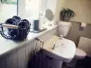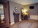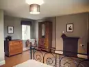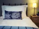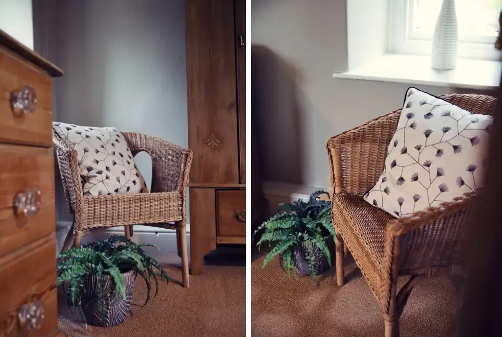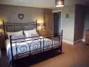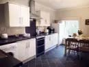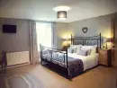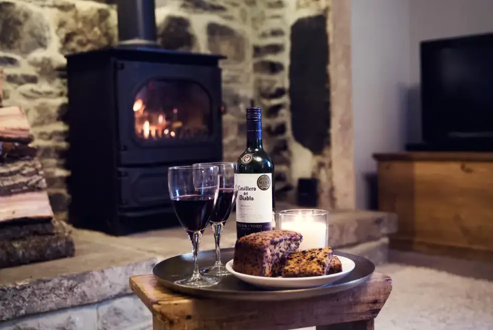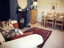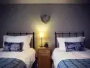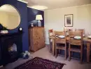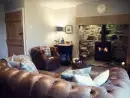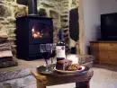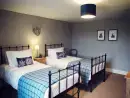The cottage offers two bedrooms: one with a super king-size bed and a family room equipped with two single beds and an additional pull-out bed. The bathroom includes a bath, shower over, basin, and WC. Additional living spaces include a fully equipped kitchen, a dining room, and a sitting room with a woodburning stove, perfect for cosy evenings.