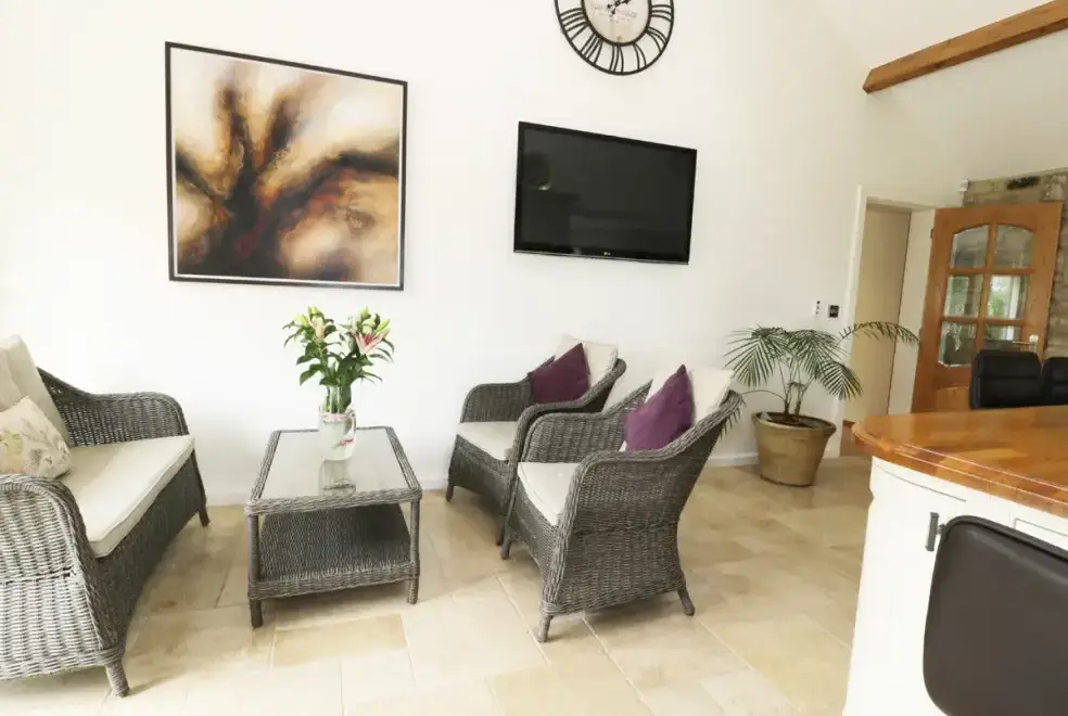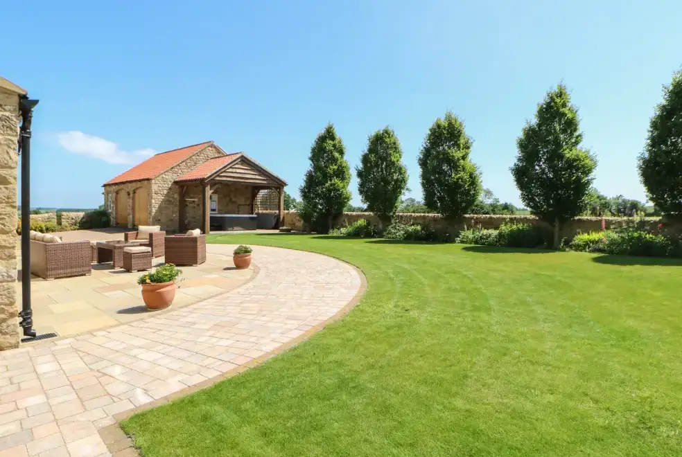 The expansive outdoor space at Bell House Barn includes a south-facing garden with well-maintained lawns, stocked borders, and large patio areas. This setting is ideal for al fresco dining and enjoying the sunset over the idyllic countryside. Inside, the cottage retains its rustic charm with exposed stone walls and wooden beams, providing a perfect blend of tradition and modern comfort.