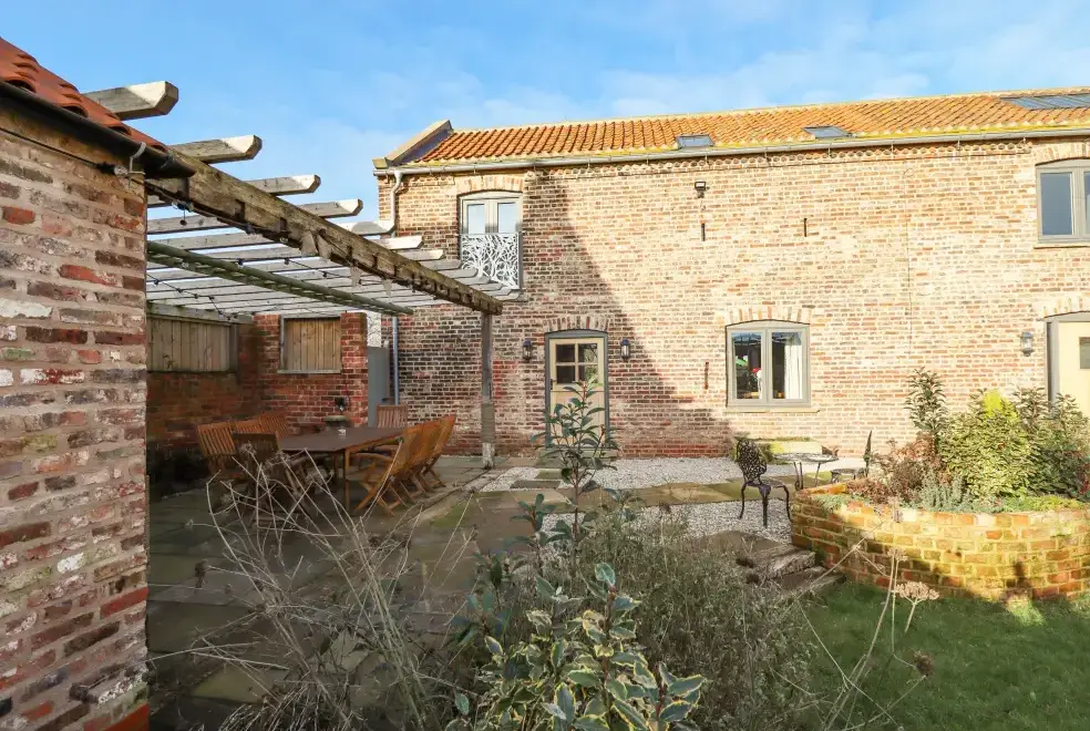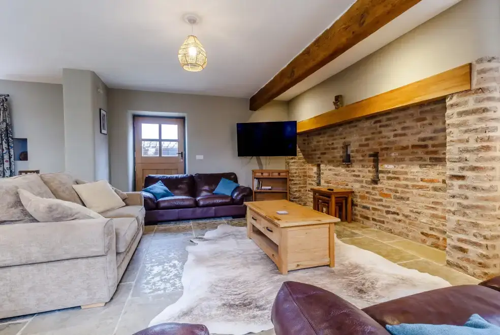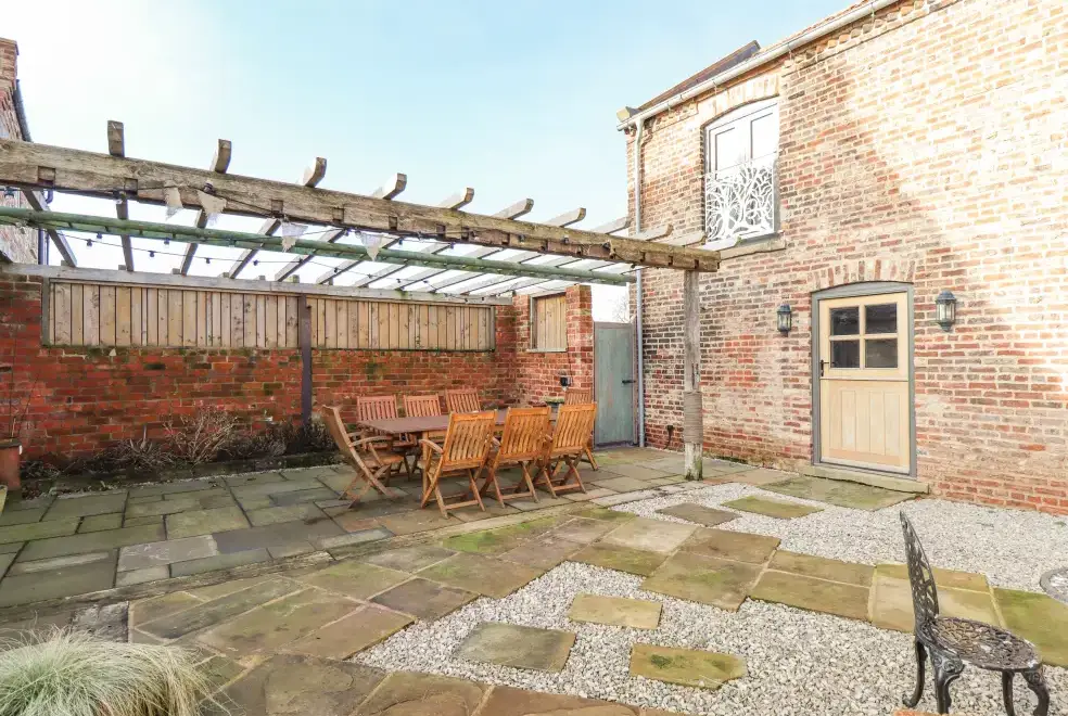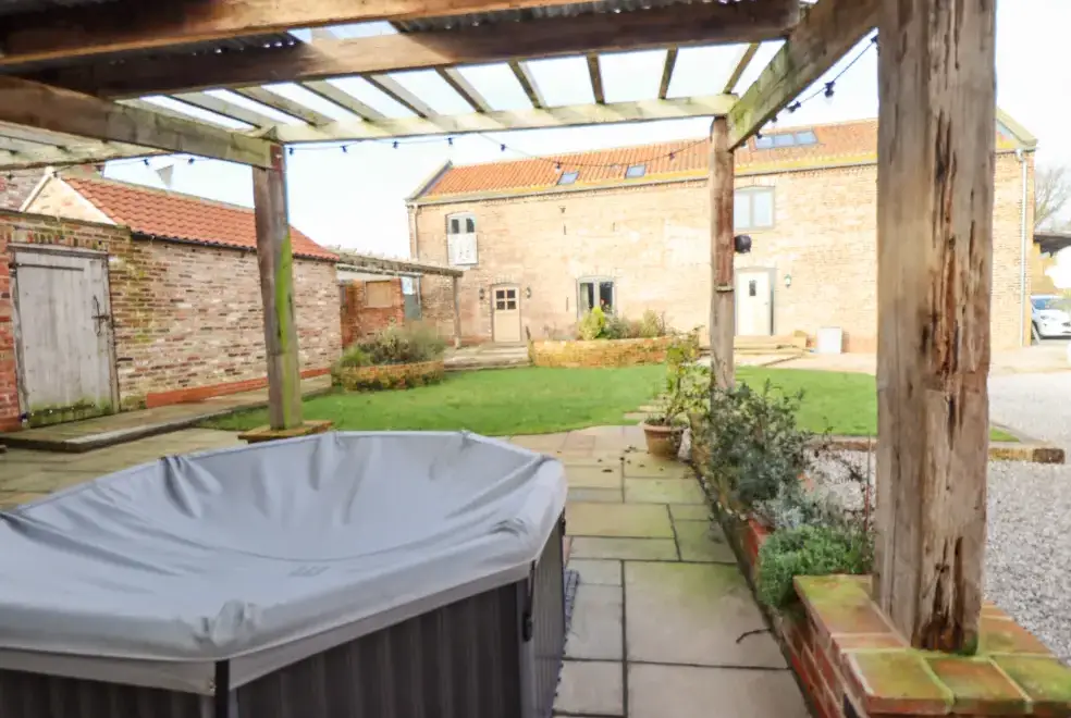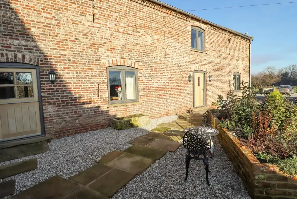 The courtyard at The Hay Barn includes a small lawned area with children's play equipment like ride-on toys, a seesaw, and a climbing frame. This pet-friendly property welcomes two well-behaved dogs, with other pets considered upon request. Located just 500 metres from a riding school, The Hay Barn is also close to local amenities, with a shop 1.2 miles away and a pub 0.7 miles away, perfect for those exploring the countryside.