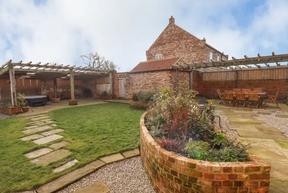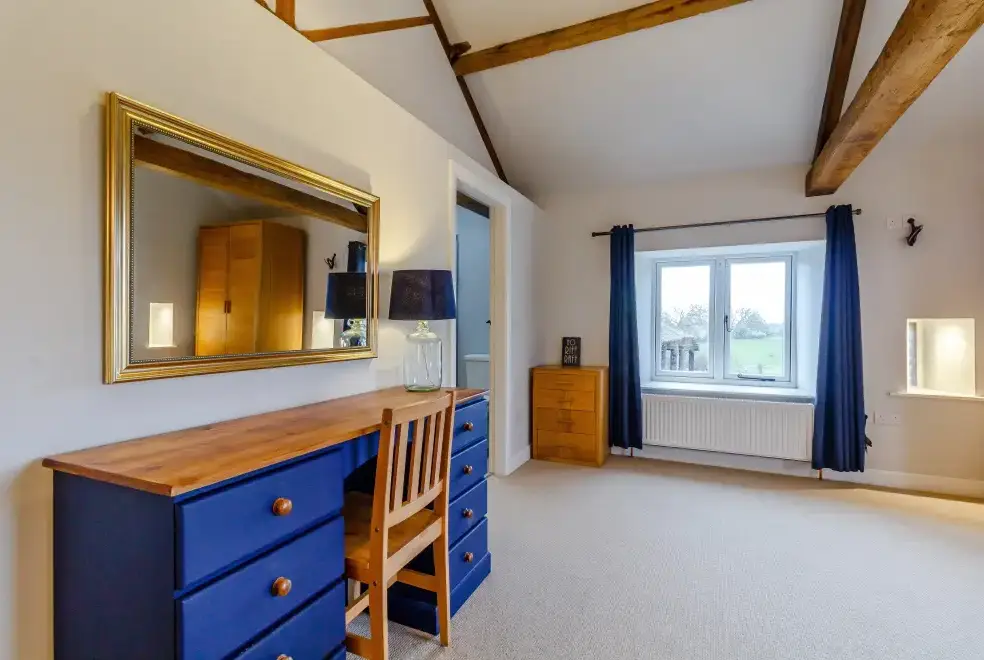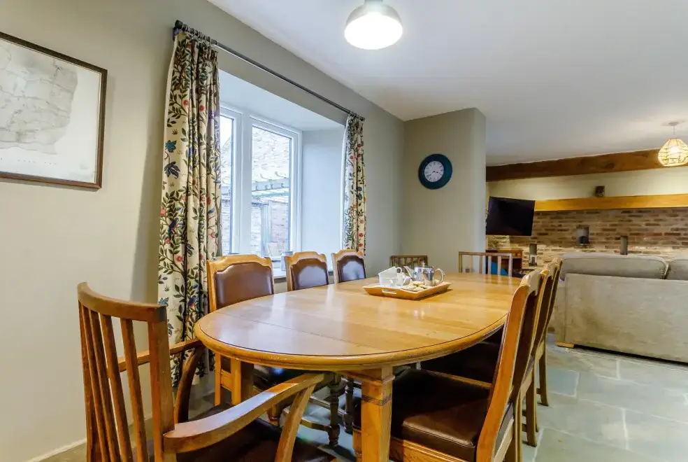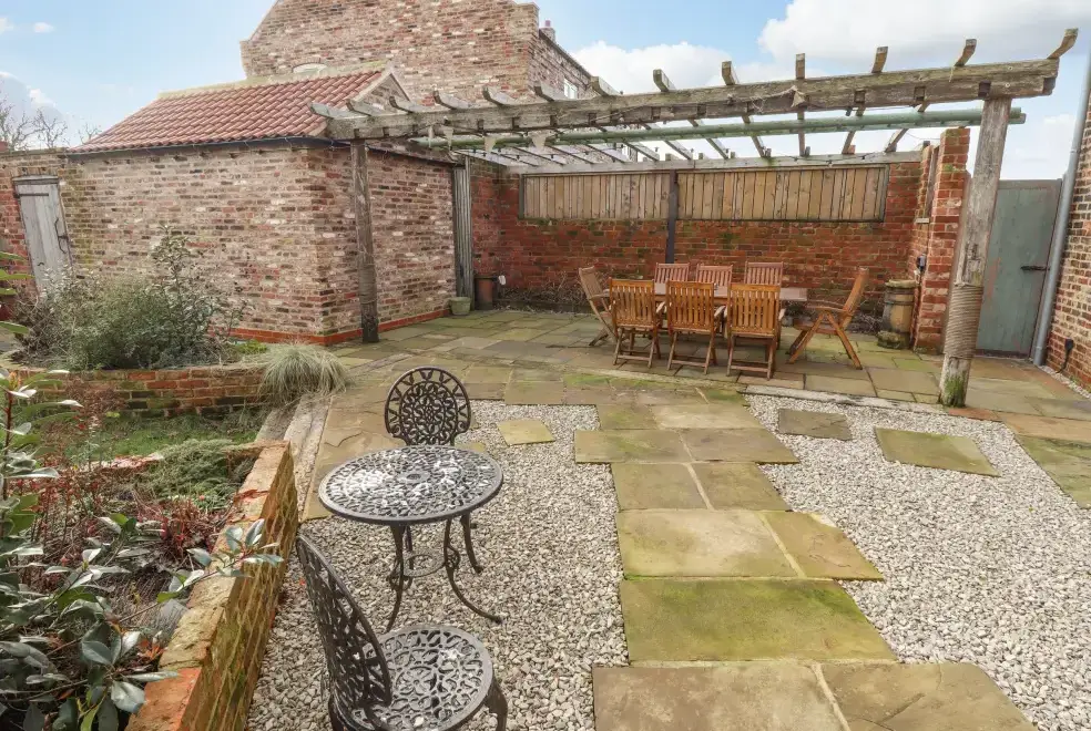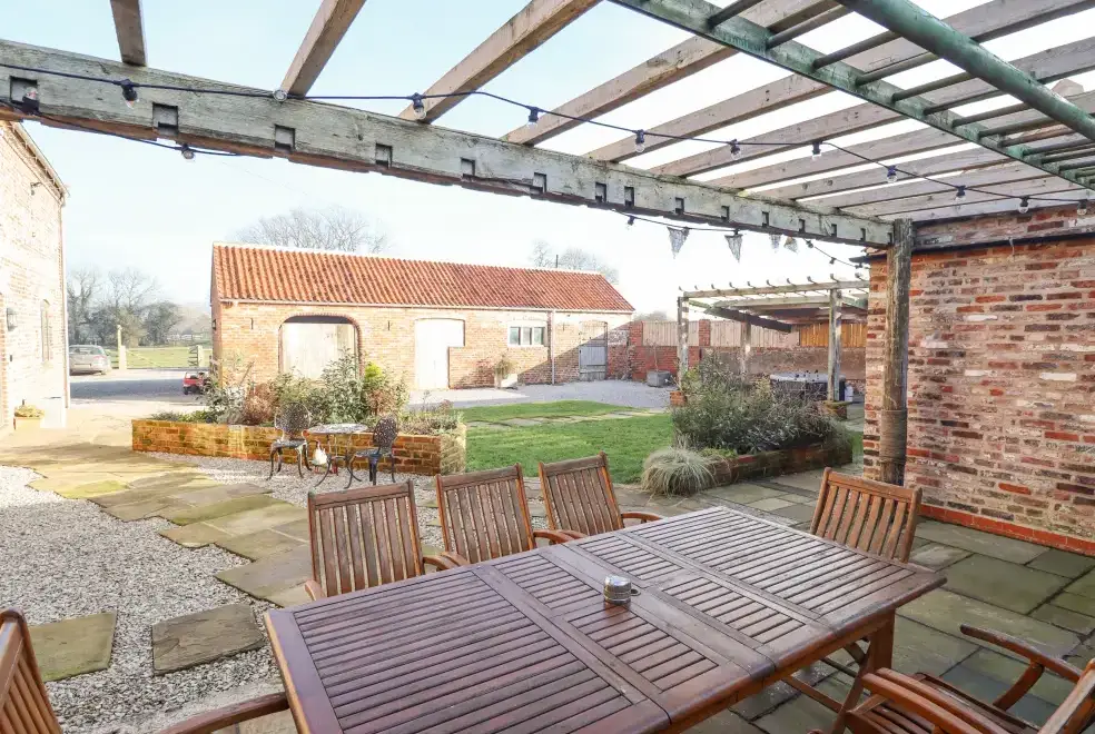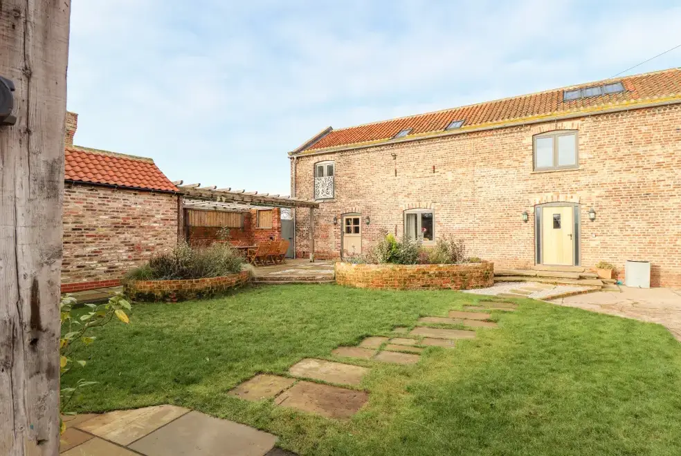 The courtyard at The Hay Barn includes a small lawned area with children's play equipment like ride-on toys, a seesaw, and a climbing frame. This pet-friendly property welcomes two well-behaved dogs, with other pets considered upon request. Located just 500 metres from a riding school, The Hay Barn is also close to local amenities, with a shop 1.2 miles away and a pub 0.7 miles away, perfect for those exploring the countryside.
