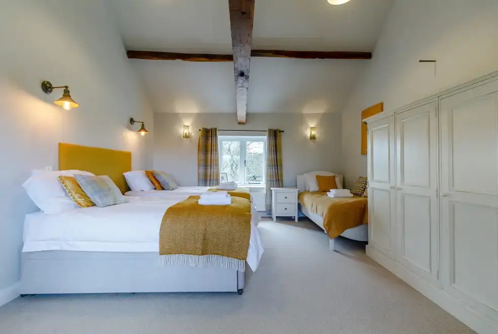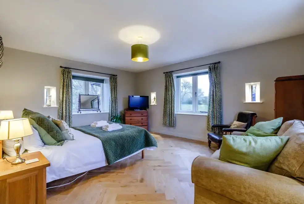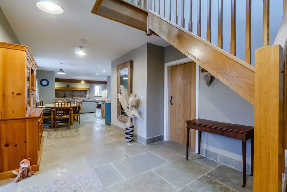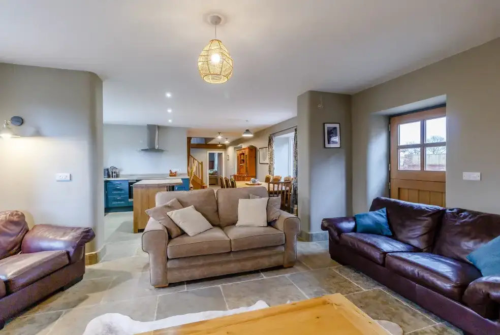 On the first floor, The Hay Barn boasts two king-size bedrooms with en-suite showers and a family room featuring a king-size and a single bed, complemented by a family bathroom. The property is equipped with underfloor heating, ensuring comfort throughout your stay. Outside, ample private parking is available for six vehicles, alongside an enclosed rear courtyard with furniture.