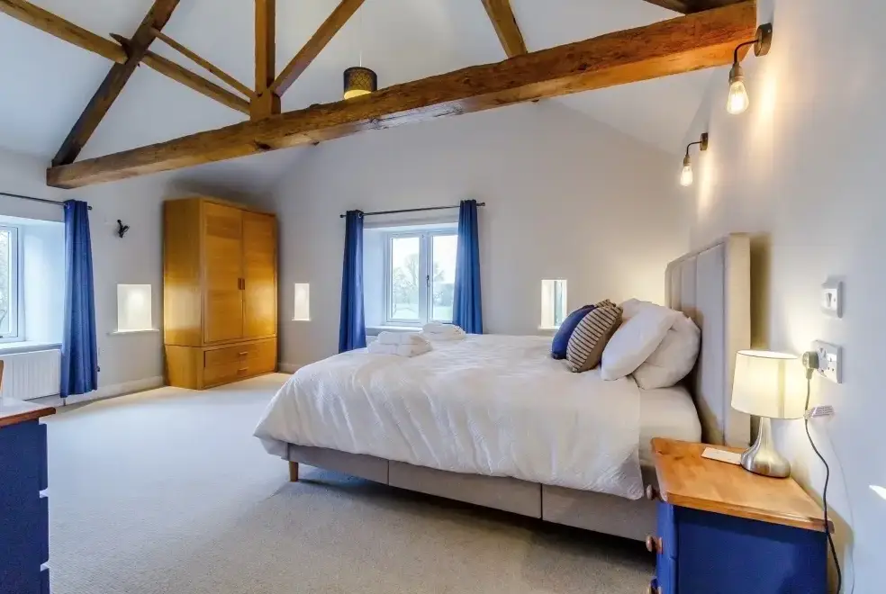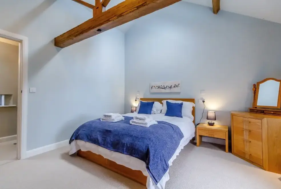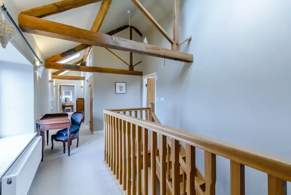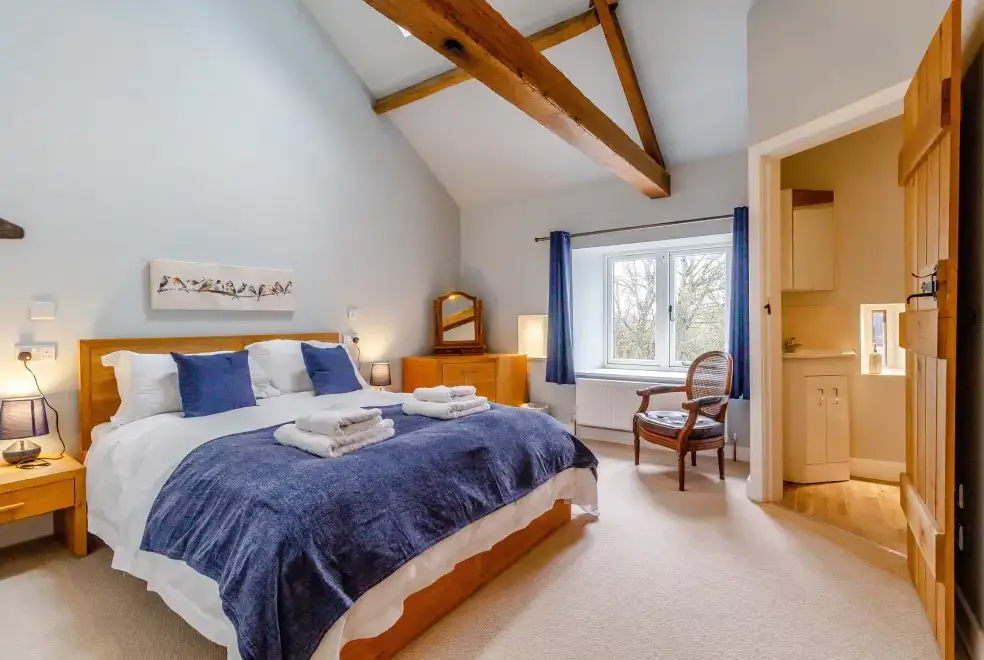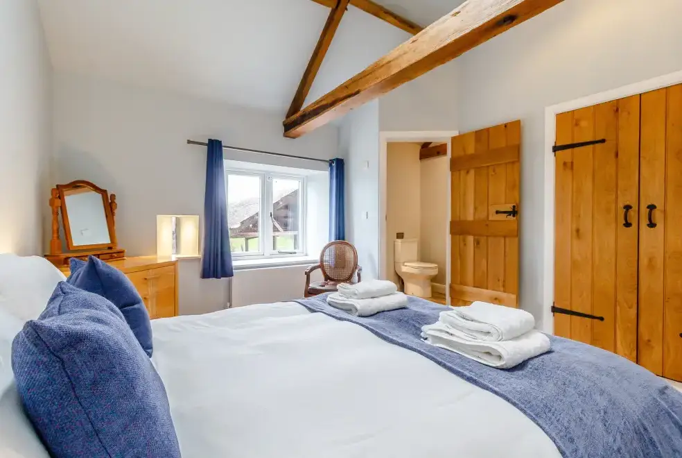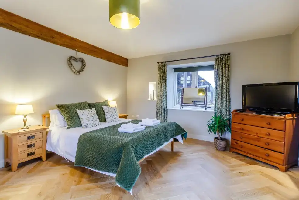The Hay Barn's ground floor offers a super king-size or two single beds with an en-suite shower room, a downstairs cloakroom, and an open-plan living area with a kitchen, dining, and sitting area, plus a snug. The modern kitchen is equipped with electric double ovens, a hob, and a fridge. Entertainment options include two TVs and WiFi in this exquisite barn conversion.
