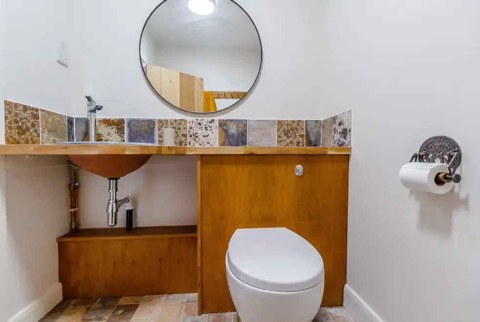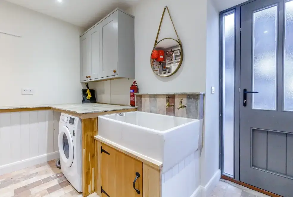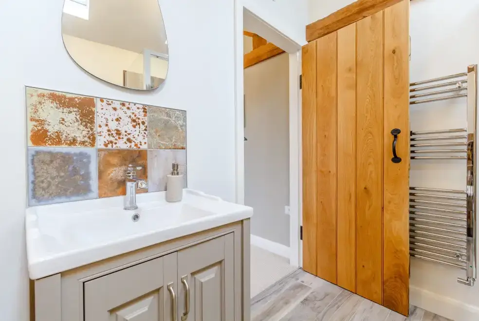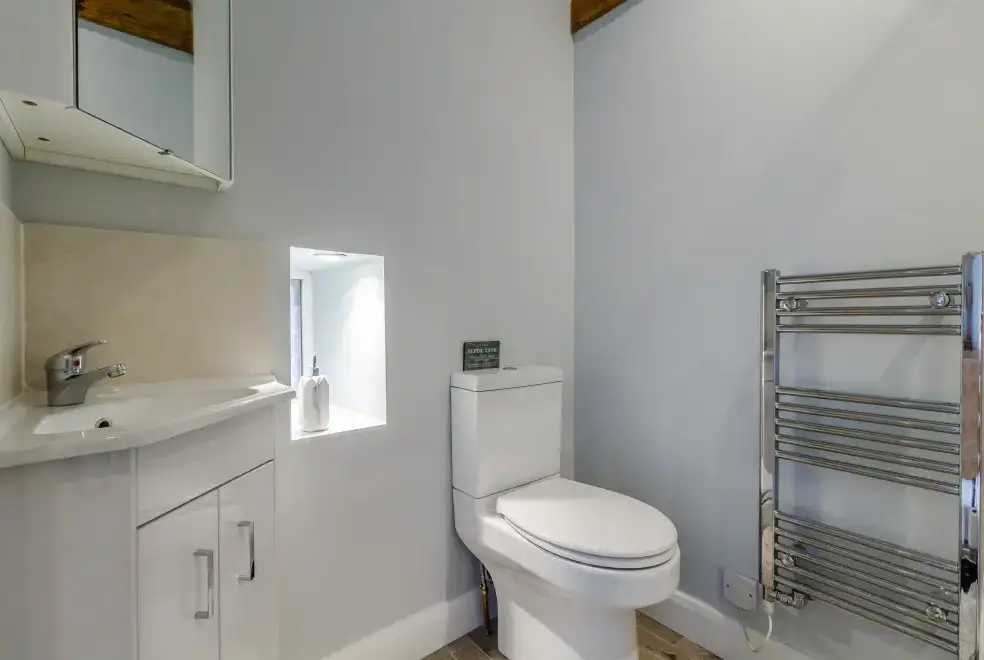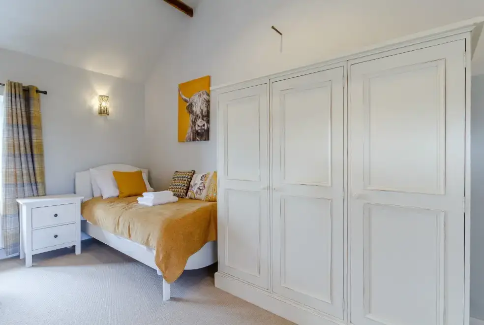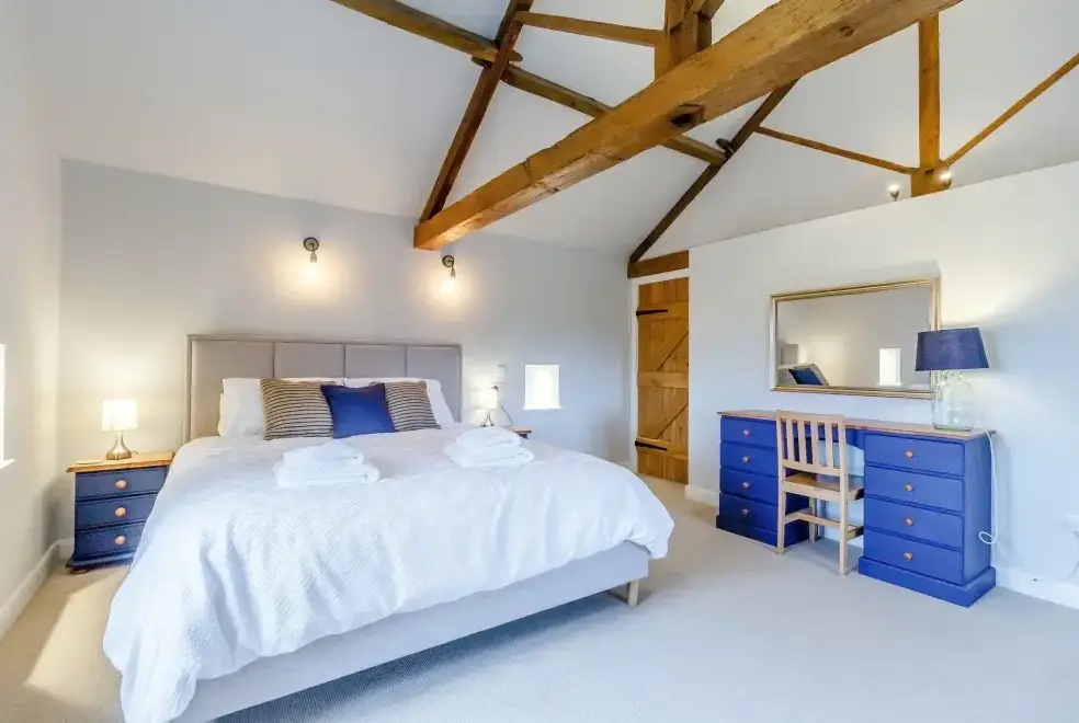 The Hay Barn's ground floor offers a super king-size or two single beds with an en-suite shower room, a downstairs cloakroom, and an open-plan living area with a kitchen, dining, and sitting area, plus a snug. The modern kitchen is equipped with electric double ovens, a hob, and a fridge. Entertainment options include two TVs and WiFi in this exquisite barn conversion.