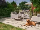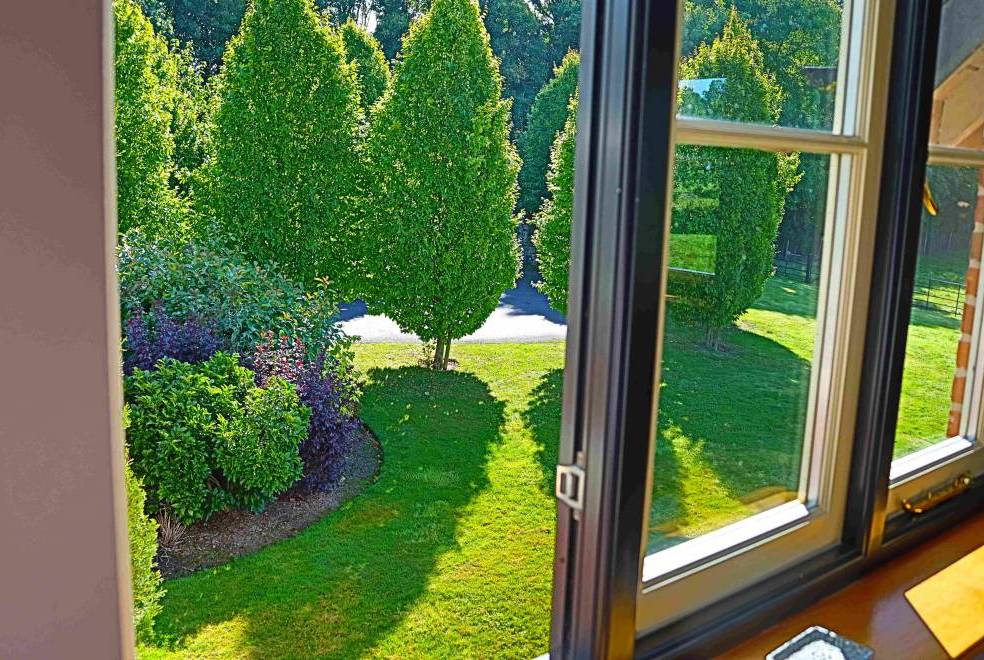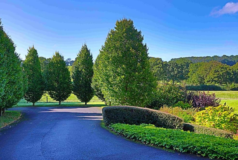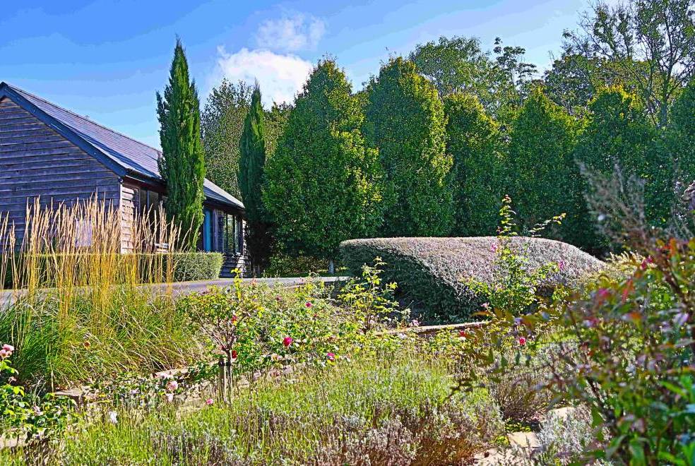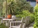 Outside there is a generous lawned garden with lots of plants and flowers by the entrance.
