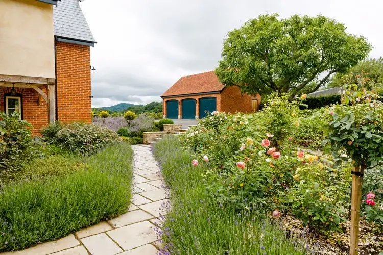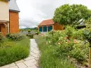 Outside there is a generous lawned garden with lots of plants and flowers by the entrance.