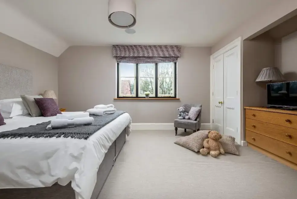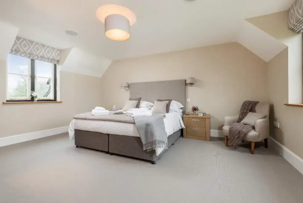 This fabulous luxury property in Checkley, Herefordshire, offers high class accommodation for up to ten people in five bedrooms of which three have en-suite bathrooms. One of these is a ground floor bedroom with a king-size bed and its own facilities. Upstairs there are 3 bedrooms with super king size beds and 1 twin bedroom with zip and link beds (so can be converted in to a super-king size bed if required and requested in advance). The living area is open plan with a separate kitchen.