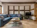 Living room; this spacious room has plenty of sofas and features a wood burning stove as well as doors that lead out to the garden. A selection of games and DVDs are available.