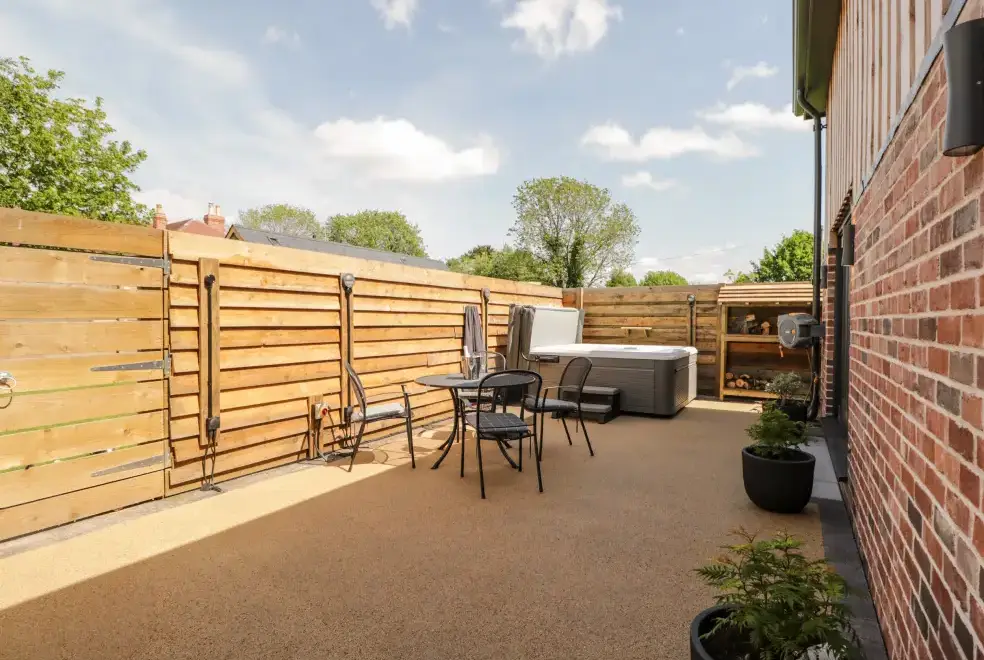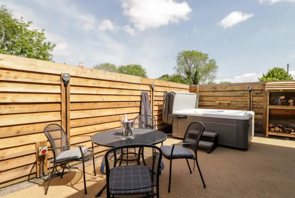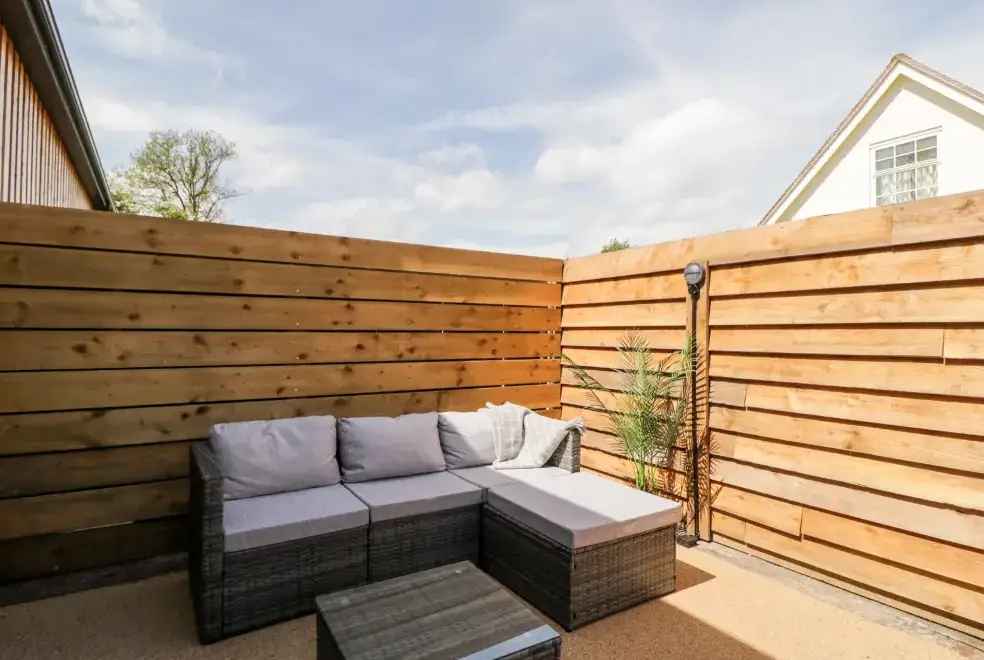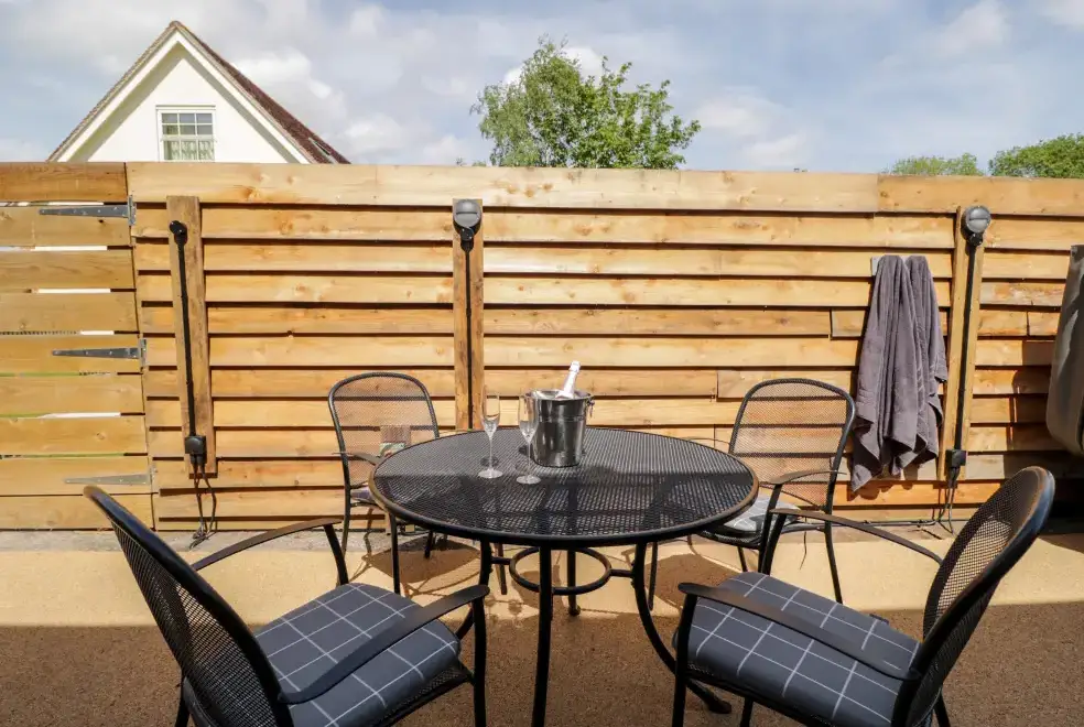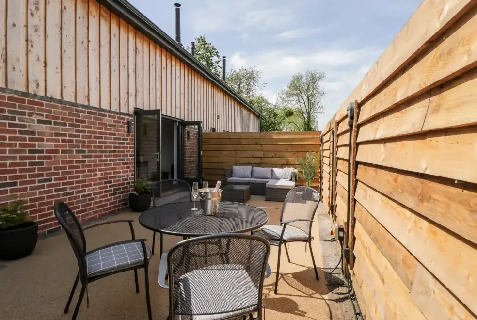The Little Lug lodge boasts an inviting living space, featuring a kitchen/diner equipped with an electric oven, induction hob, microwave, fridge/freezer, and dishwasher. Relax in the sitting room complete with a Smart TV and a cosy woodburning stove. For added convenience, there's a cloakroom available. The Little Lug’s living areas offer a perfect blend of modern amenities and comfort, setting the stage for a romantic getaway in Hereford.Relax and Rejuvenate in the Little Lug's Outdoor Spaces