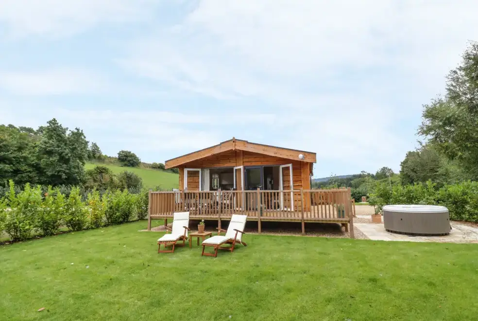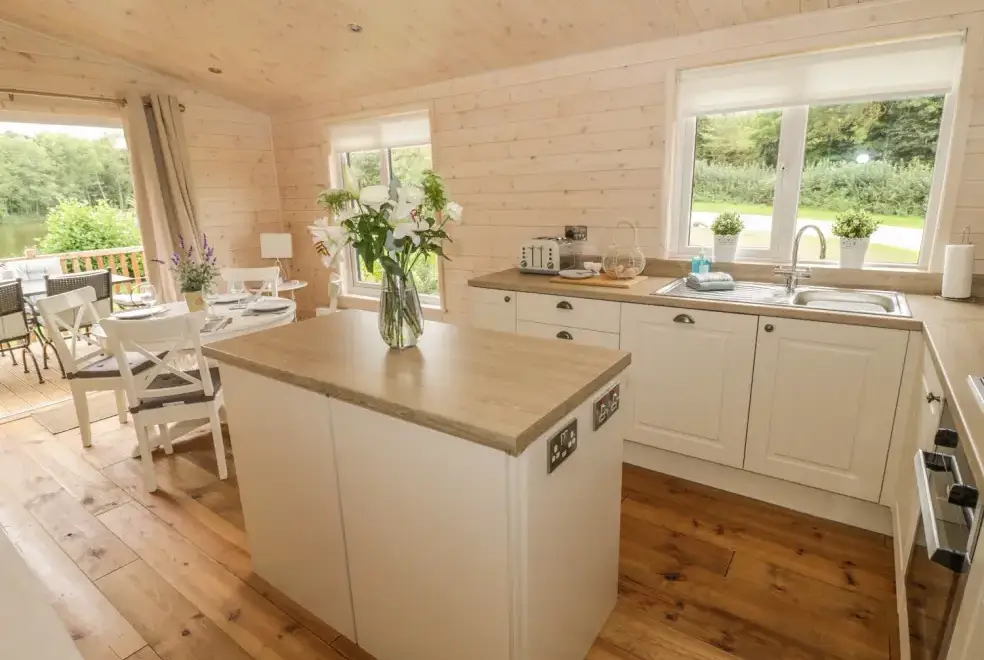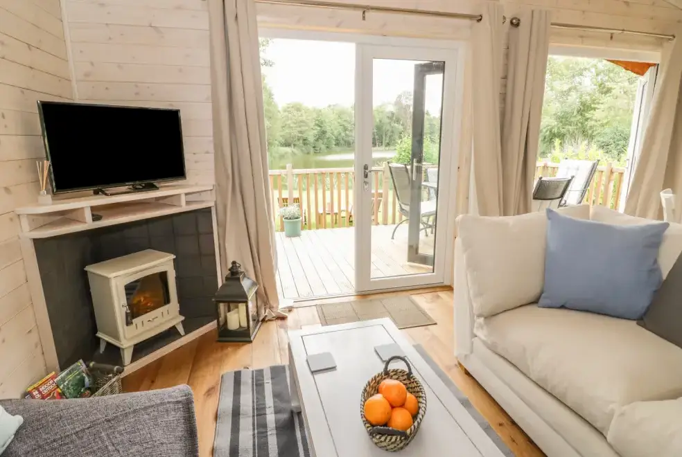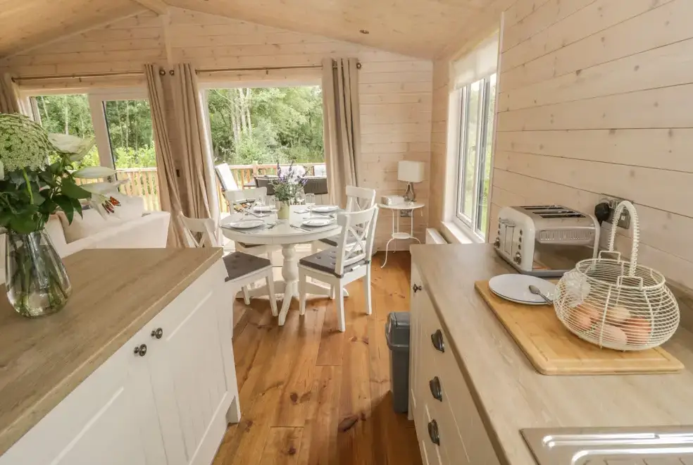 This beautiful, modern wooden lodge offers all ground-floor accommodation. It includes two bedrooms: one king-size double (zip/link, can be configured as two singles on request) with an en-suite shower, basin, and WC; and one twin (zip/link, can be a king-size double on request) with an en-suite bath, shower over, basin, and WC. The open-plan living area encompasses a kitchen, dining space, and sitting area, complete with an electric flame effect stove. This setup makes Mallard Cottage an ideal property for a small family holiday or a romantic break in the serene Wye Valley.