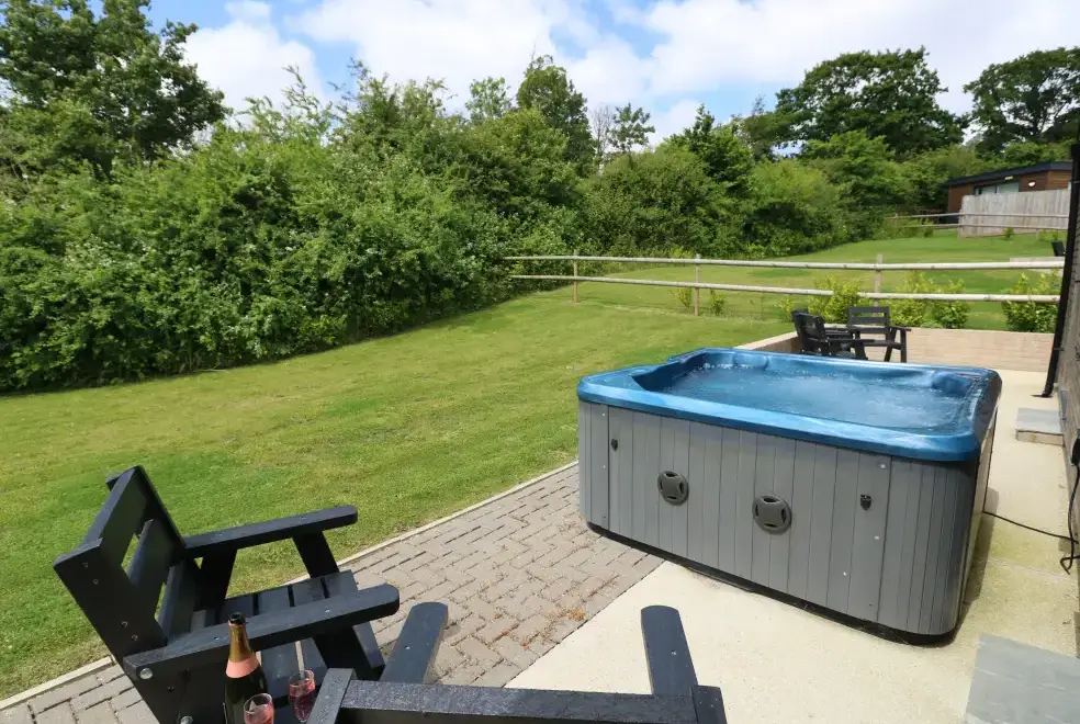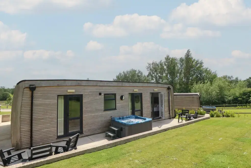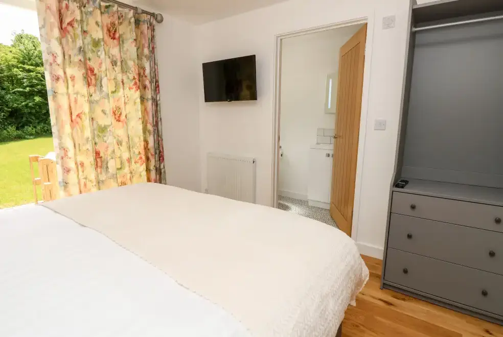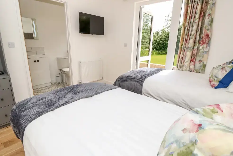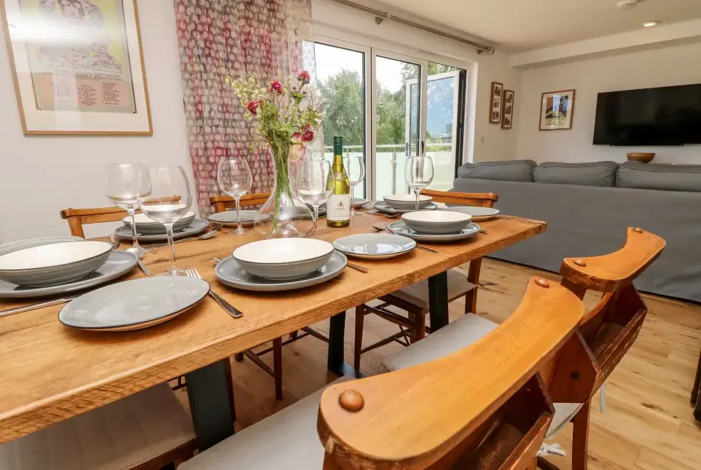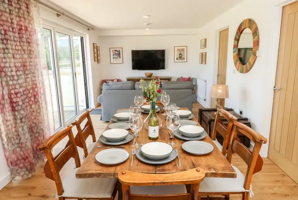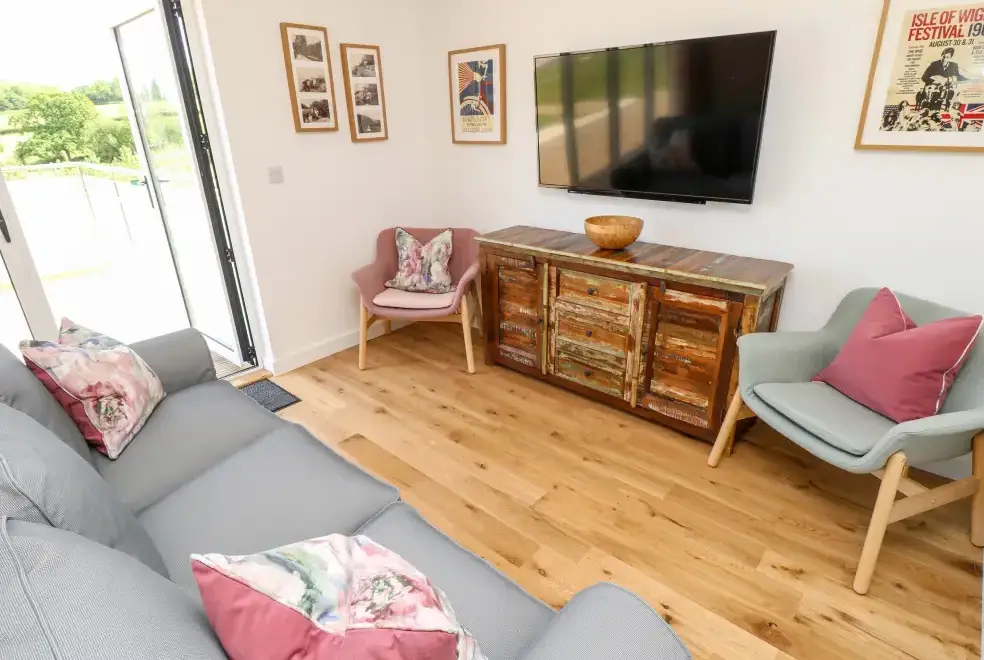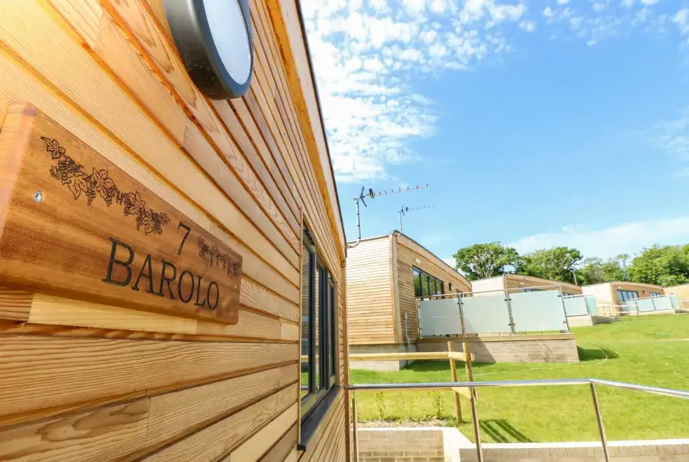 Barolo, a two-bedroom eco lodge on the Isle of Wight, offers a luxurious open-plan living area complete with a modern kitchen equipped with an electric oven, hob, microwave, fridge with ice box, washing machine, and dishwasher. The dining area provides ample seating, while the sitting room is perfect for unwinding with a TV. The property ensures comfort and convenience, ideal for a relaxing stay on the beautiful Isle of Wight.Luxurious Bedrooms with En-Suite Facilities