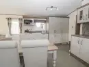 Book a holiday lodge beside the water at the South Lakeland Leisure Village on the edge of Arnside and Silverdale Area of Outstanding Natural Beauty. The leisure village is a short drive away from the Lake District, the Yorkshire Dales National Park and the Forest of Bowlland, another stunning rural area.The lodge is one of several on this site. It has two bedrooms, two bathrooms and guests may bring one dog. In common with other lodges on-site it has a wooden veranda with garden furniture, so that guests can sit out or enjoy lunch in the fresh air on good days. The lodge has a spacious open-plan living area; a fitted kitchen is built along two walls, a dining table with four chairs separates the business end of the room from the sofas and relaxing end. The sofas and furnishings are all in neutral shades that are easy on the eye.