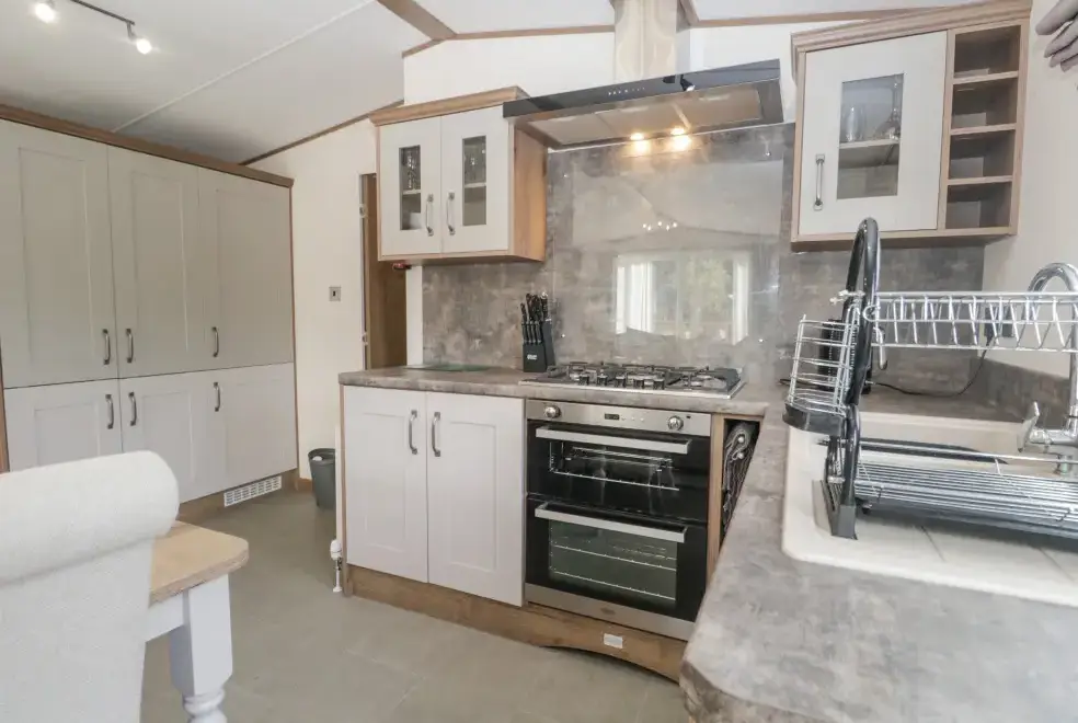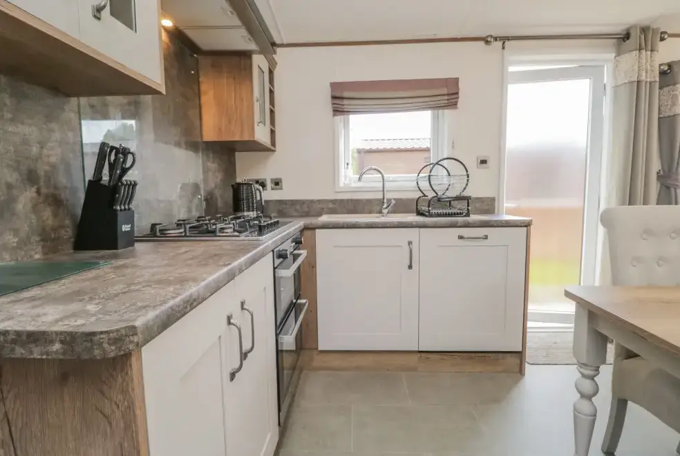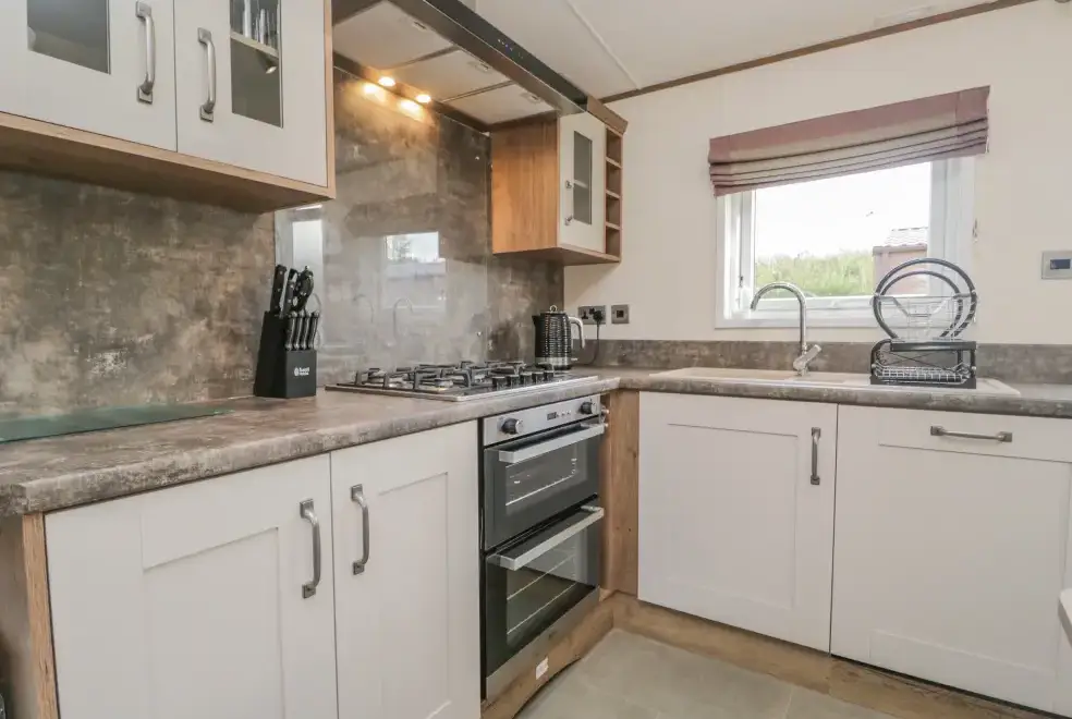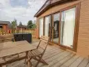 Patio doors from the living area open out onto the decking where there are tables and chairs for outdoor dining, relaxing and chatting. One dog is welcome. The holiday accommodation is ready to move into when you arrive, it is gas centrally heated and has a gas hob and electric oven for cooking. There are some optional facilities on the site, such as a swimming pool which could be popular with some guests, a café gym, a restaurant, and fishing is possible on the lake.
