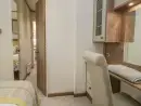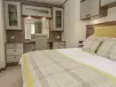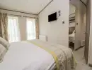 The first double bedroom is attractively styled, the bed has a buttoned and padded headboard, there are cupboards over the bed and a fitted dressing table and cupboards on an adjoining wall. A television is mounted high on the wall for relaxed viewing in bed.