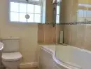 The stylish bathroom has a shower above a p-shaped bath and heated towel rail.