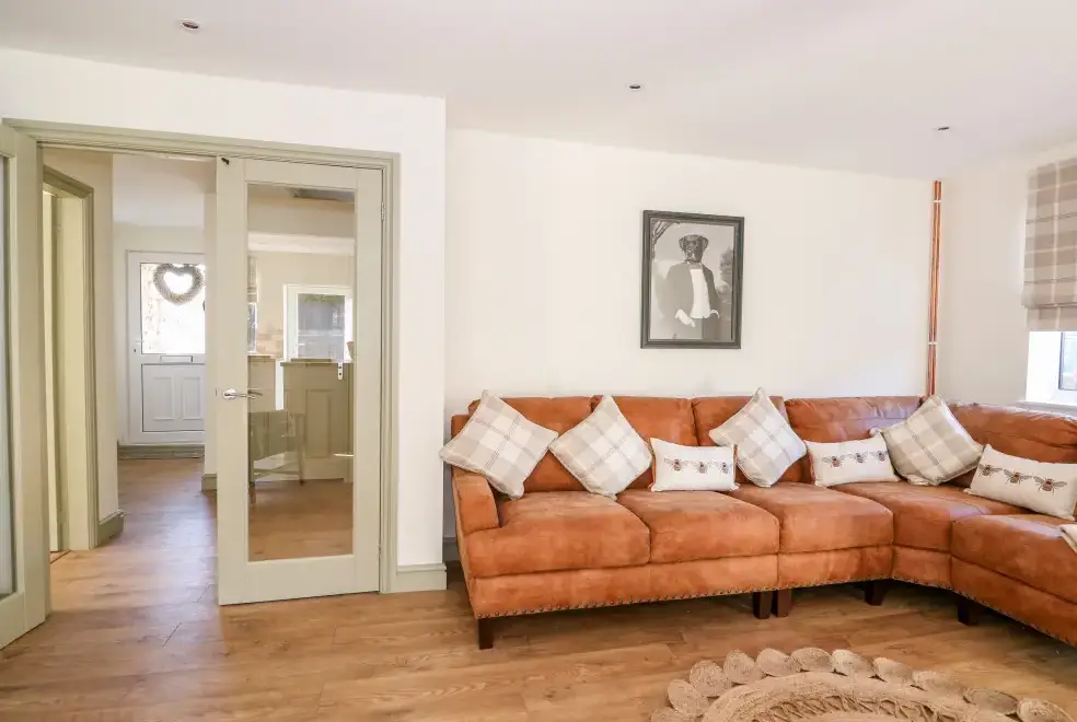 Inside the open-plan living space, an elegant leather corner sofa and wall-mounted television offer evening entertainment. The kitchen and dining area, complete with a central island and geese-themed wallpaper, provide a delightful setting for family celebrations. Outdoors, the excitement continues with a large enclosed lawn, patio, and games room featuring a pool table and games. The utility room houses a washing machine and tumble dryer for added convenience. Whether you're relaxing with your canine companion or enjoying recreational activities, Giggling Goose Cottage caters to all your needs.