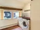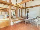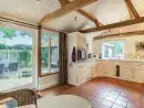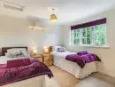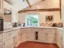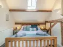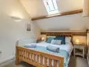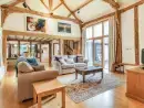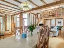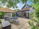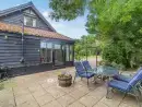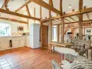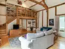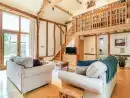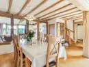 Ducksfoot Barn showcases a blend of rustic charm and contemporary comfort with its part-vaulted ceiling, exposed beams, and elegant oak flooring. The spacious and light-filled open plan living area boasts a large fitted kitchen with French doors leading to a quaint courtyard garden. The dining area and sitting area, which includes two plush sofas with one convertible to a sofa bed, also open onto another courtyard space, creating a seamless indoor-outdoor living experience.