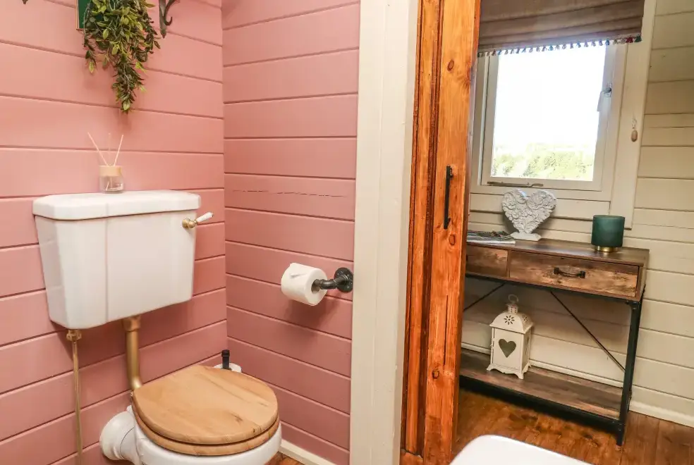 Inside Westfield Lodge, you'll find a welcoming open-plan living area with exposed beams gracing the vaulted ceiling, creating a characterful and relaxing atmosphere. After a day of exploring, settle down in front of the wall-mounted television with a glass of wine and enjoy the gentle glow of the electric fire. The kitchenette is thoughtfully equipped with country-style fittings and all the essentials for preparing simple meals, perfect for a romantic dinner for two at the adjacent dining table.