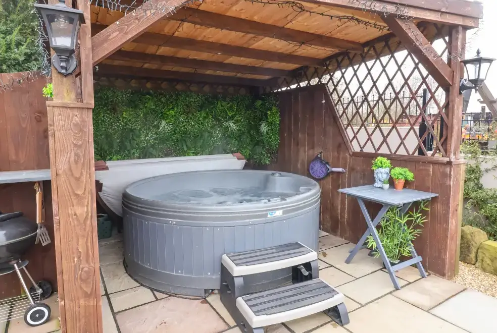 As evening falls, retreat to the beautifully appointed bedroom featuring a double bed with an elegant iron frame, rustic beams, and tasteful floral accents. The nearby shower room is bright and stylish, complete with a spacious walk-in shower. Step outside to the charming side patio to relax with a drink and watch the sunset over the hills, or indulge in the luxury of your private hot tub under the stars.