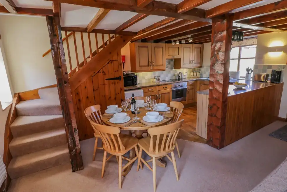 Nestled in an elevated position above Ruswarp village, Danby Cottage is one of eight properties in a small development of converted barns. This cottage is perfect for families seeking a peaceful retreat while remaining just a short five-minute drive from the vibrant Whitby seaside town. The spacious open plan living area is beautifully furnished, featuring character beams and a stone fireplace with a gas woodburner-effect stove, creating a cosy atmosphere. The kitchen is well-equipped, and the separate dining area is perfect for family meals. Upstairs, the three bedrooms offer stunning views of the distant hills.