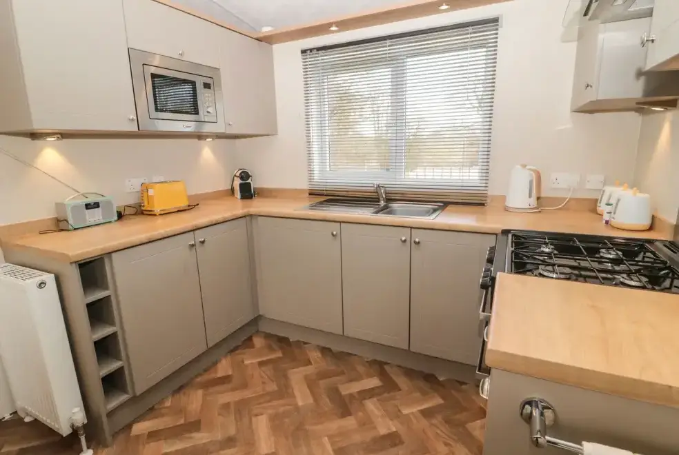For a more formal seating arrangement, gather around the intimate dining table and enjoy a morning coffee or a home-cooked family favourite at dinner. The kitchen is the ideal spot to rustle up these nostalgic treats. There’s plenty of space for all your culinary dreams, and it’s kitted out with an electric oven, gas hob, microwave, and a fridge/freezer.