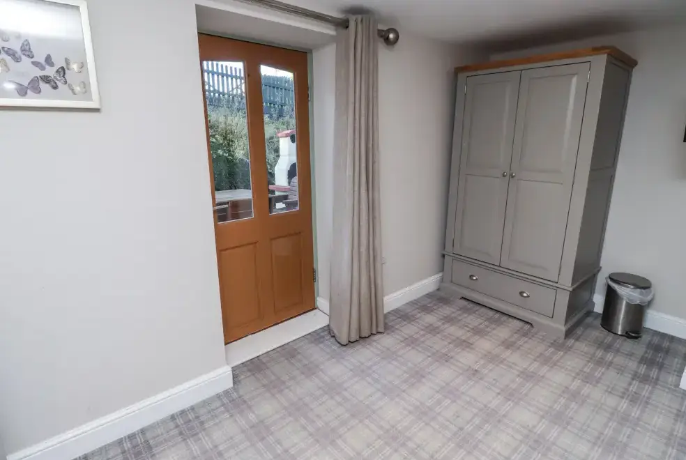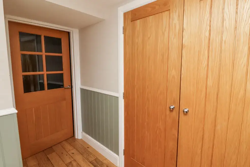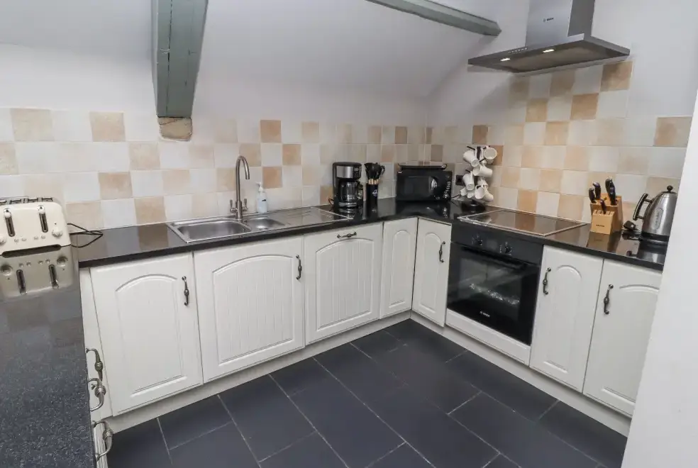 The Old Mill features reverse living across three storeys, enhancing its charm and functionality. The accommodation includes three bedrooms: one twin with an en-suite bathroom and two ground-floor king-size rooms that can be converted to twin beds upon request, each with en-suite facilities. The second floor boasts an open-plan living space with a kitchen, dining area, and a sitting area complete with an open fire. Additionally, guests can enjoy a first-floor cloakroom, a snug perfect for relaxation, and a ground-floor cycle store. The vaulted ceiling, exposed brickwork, and solid wood flooring contribute to the inviting ambiance of this historic property.