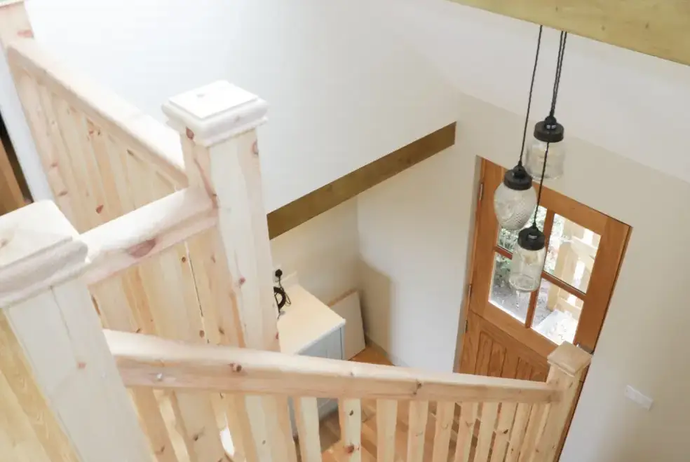 Ascending the stairs, you will find a contemporary styled bathroom with attractive features, leading to a tranquil double bedroom that overlooks the garden. Adjacent is a super king-size bedroom, featuring a vast window backdrop that offers panoramic views of the open fields and greenery. The outside of this cottage boasts a charming gravelled area with furniture, perfect for enjoying a glass of wine while soaking in the enchanting scenery. For added relaxation, guests can indulge in the hot tub and admire the captivating views.