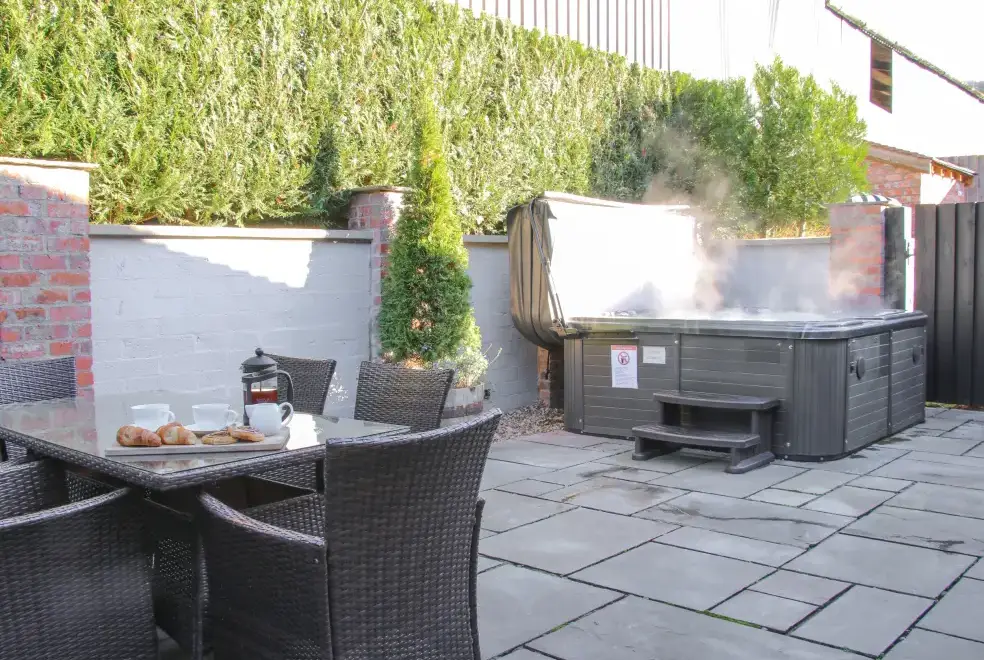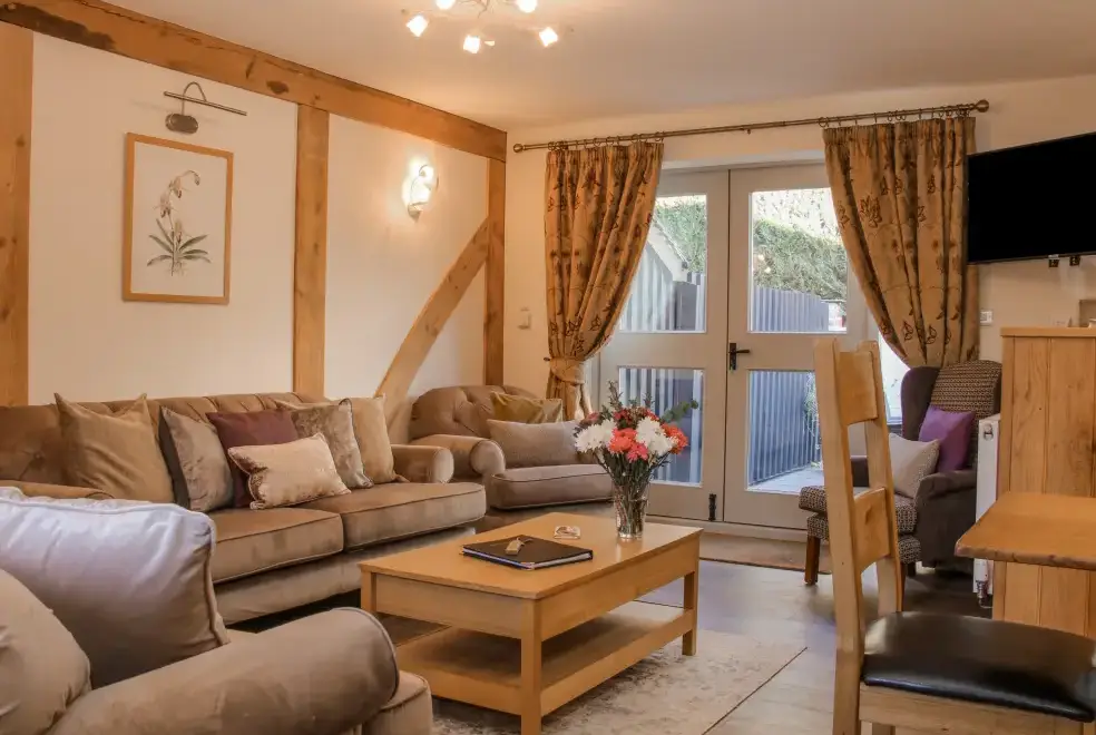 The Turnip House is a stunning 19th-century barn conversion set within a picturesque courtyard on expansive farmland in the scenic Hope Valley. This Westhope cottage has been thoughtfully transformed to provide a spacious, open-plan living experience, featuring three bedrooms and two bathrooms. Guests can indulge in the luxury of a private hot tub and enjoy shared access to a games room and gym. Whether you're seeking a romantic getaway or a family holiday, this charming cottage offers a perfect Shropshire escape. Inside, the open-plan layout boasts a sitting area with wooden accents, plush sofas, and a mounted TV. French doors lead out to the garden, inviting you to savour the fresh countryside air.