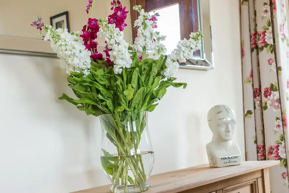 The Lodge harmoniously blends traditional charm with modern comforts, featuring an exquisite open plan living area adorned with white, pink, and wooden furnishings. The kitchen, reminiscent of a stately home, is well-equipped to meet all culinary needs in this secluded log cabin. The comfortable seating and wood burning stove enhance the homely and inviting atmosphere, perfect for relaxing after a day of exploring.
