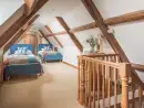 Lower Hedge Farm There are 5 bedrooms, 3 of which are ensuite and two with shared access. The bedrooms and upstairs are beamed throughout, from the long attic bedroom with 4 single beds, to the master bedroom with oak doors and beautifully crafted ensuite. The bedrooms have been designed individually to reflect the style of the house whilst providing up to date modern luxury. All come equipped with fluffy white towels and toiletries.