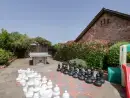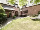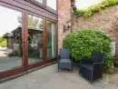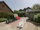 Outside is a patio area equipped with garden furniture and a BBQ which leads to a shared lawned garden. A stream flows through the grounds.
